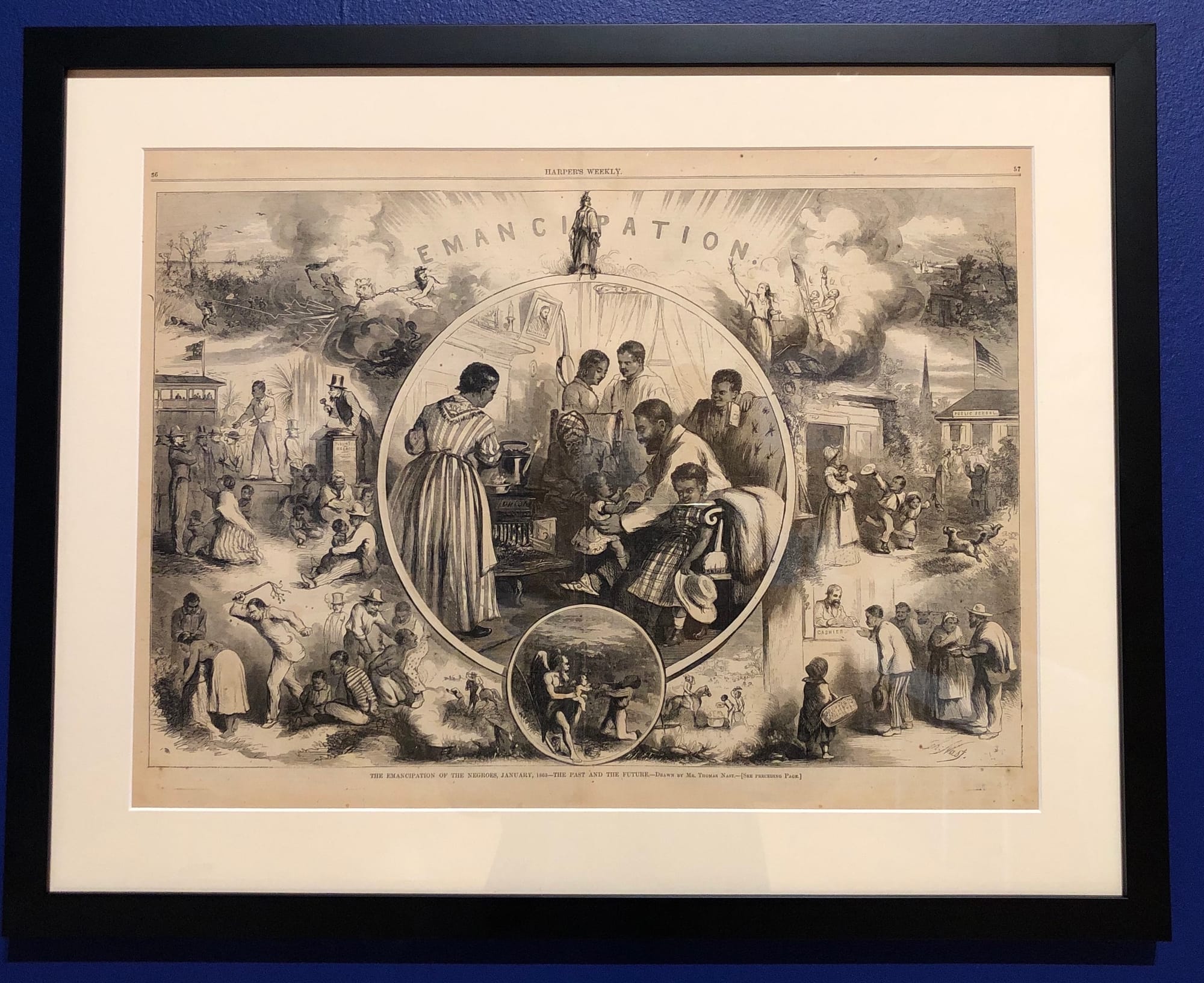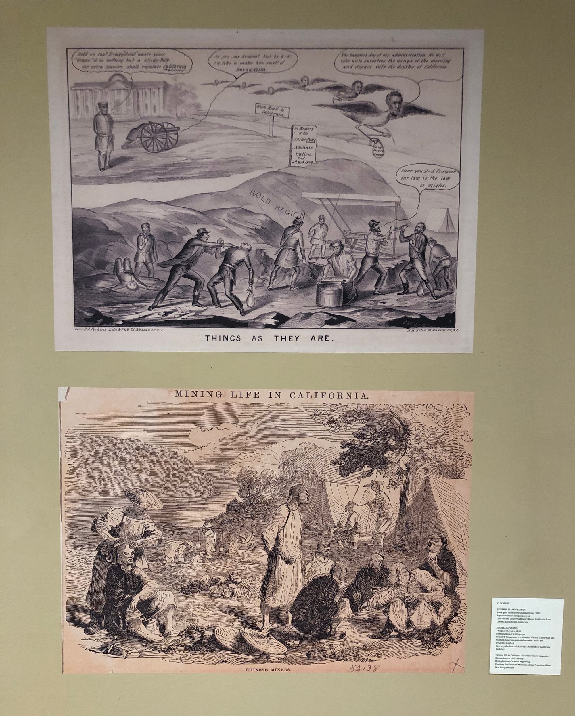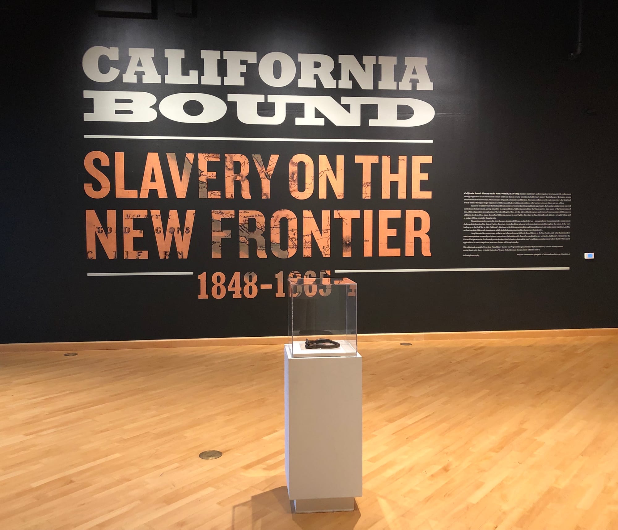 According to the exhibition, California’s position on slavery would become less ambiguous as the Civil War took shape. Pro-enslavement southern Democrats would leave California in support of the Confederacy, leaving the anti-enslavement Republican Party largely in control of the state legislature. During the Civil War, California would align itself with the North, providing the Union with logistical support and gold from its Sierra Nevada mines. While the question of slavery would be settled with the end of the Civil War, California would continue to waver on the status of its minority populations, particularly Black residents who acquired freedoms through the 13th Amendment.