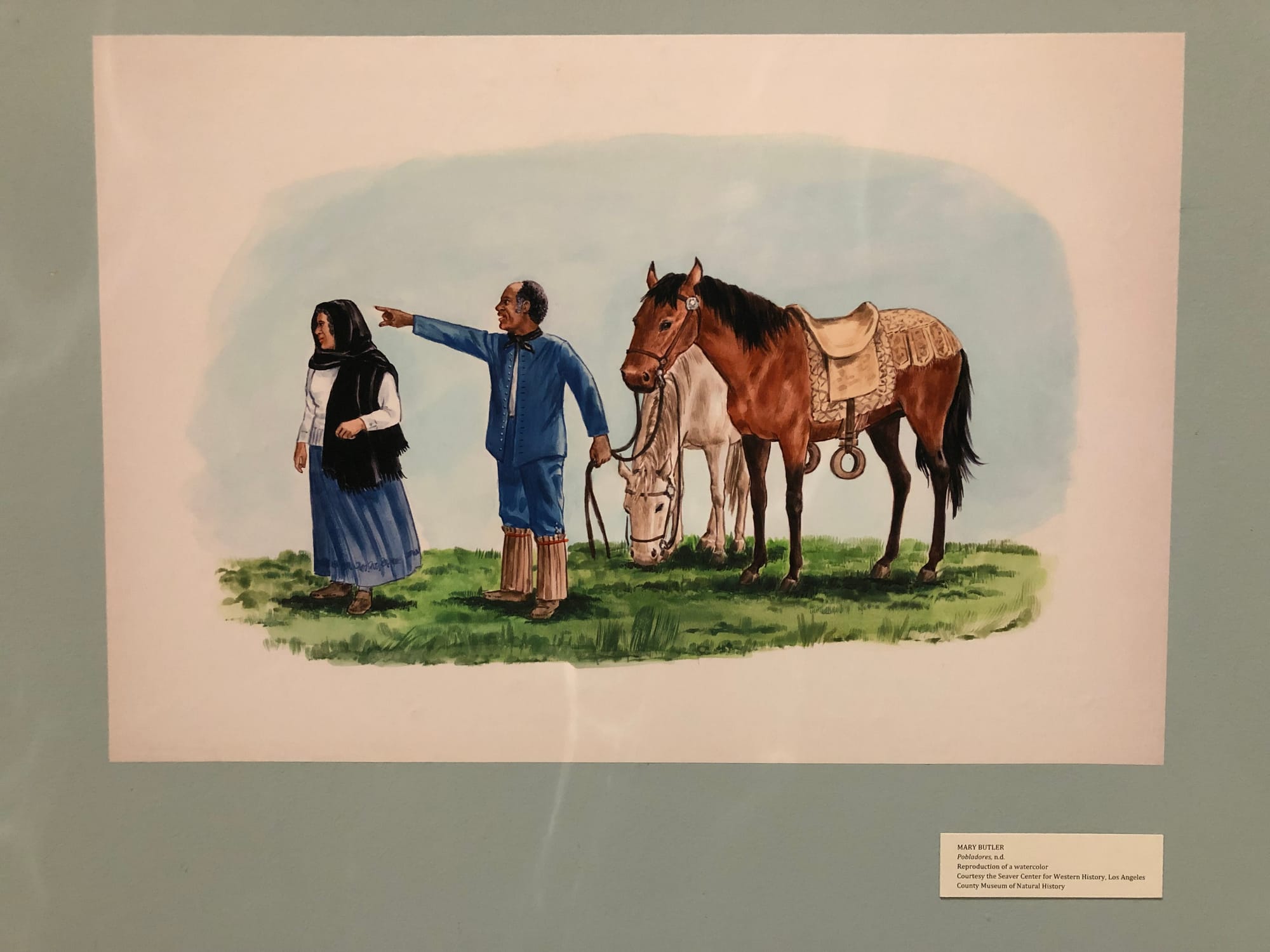 While the exhibition focuses on the hundreds of enslaved Africans who were brought to California shortly before and after its ratification as a state in 1850, the curators date the earliest presence of people of African descent in the region to the 1700s and 1800s. Spanish colonization of the Gulf of California, which relied on the labor of enslaved indigenous and African people since the 16th century, resulted in a multicultural landscape. An early community of non-Indigenous people in California were the Californios, who were either Mestizo (mixed European and Indigenous ancestry) or of mixed African and Indigenous ancestry. Among Los Angeles’s first settlers, the Pobladores who arrived from Mexico in 1781, more than half of 11 families were of African or part-African ancestry.