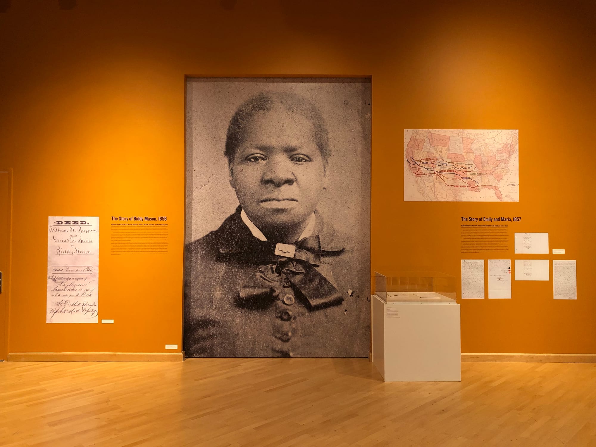 While the exhibition’s legal documents and letters don’t always make for the most compelling visual artifacts, the curators bring their contents to life by surfacing eight legal cases that resulted in freedom or enslavement for Africans living in California. There’s the story of Frank, an enslaved 18-year-old forcibly brought to work in the Sierra Nevada mines who later escaped to San Francisco and legally attained freedom with support from a local community of free Africans who petitioned on his behalf. The legal precedent in the case would shock the state’s pro-enslavement legislators and result in the passage of the state’s own Fugitive Slave Law in 1852.