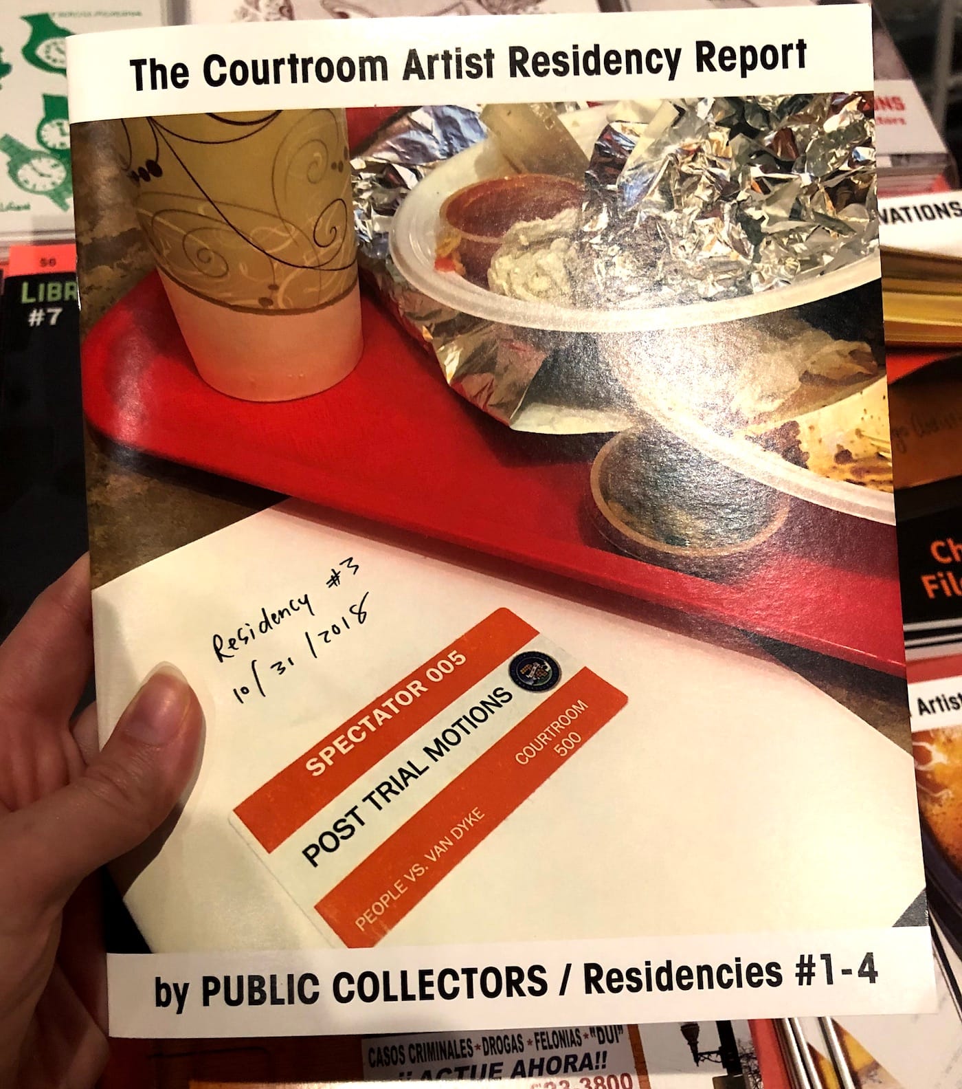 I also spent some time with the Chicago-based publisher Public Collectors. In September of 2018, cofounder Marc Fischer began the Public Collectors Courtroom Artist Residency, for which he invites artists to attend courtroom hearings in Chicago and then process what they observed over a meal. We sometimes forget that these hearings are open to the public (most of the time you’ll find the courtrooms largely empty) and the conversations documented in The Courtroom Artist Residency Report series reveal how much we could learn about the American criminal justice system if we physically participated. —EWA