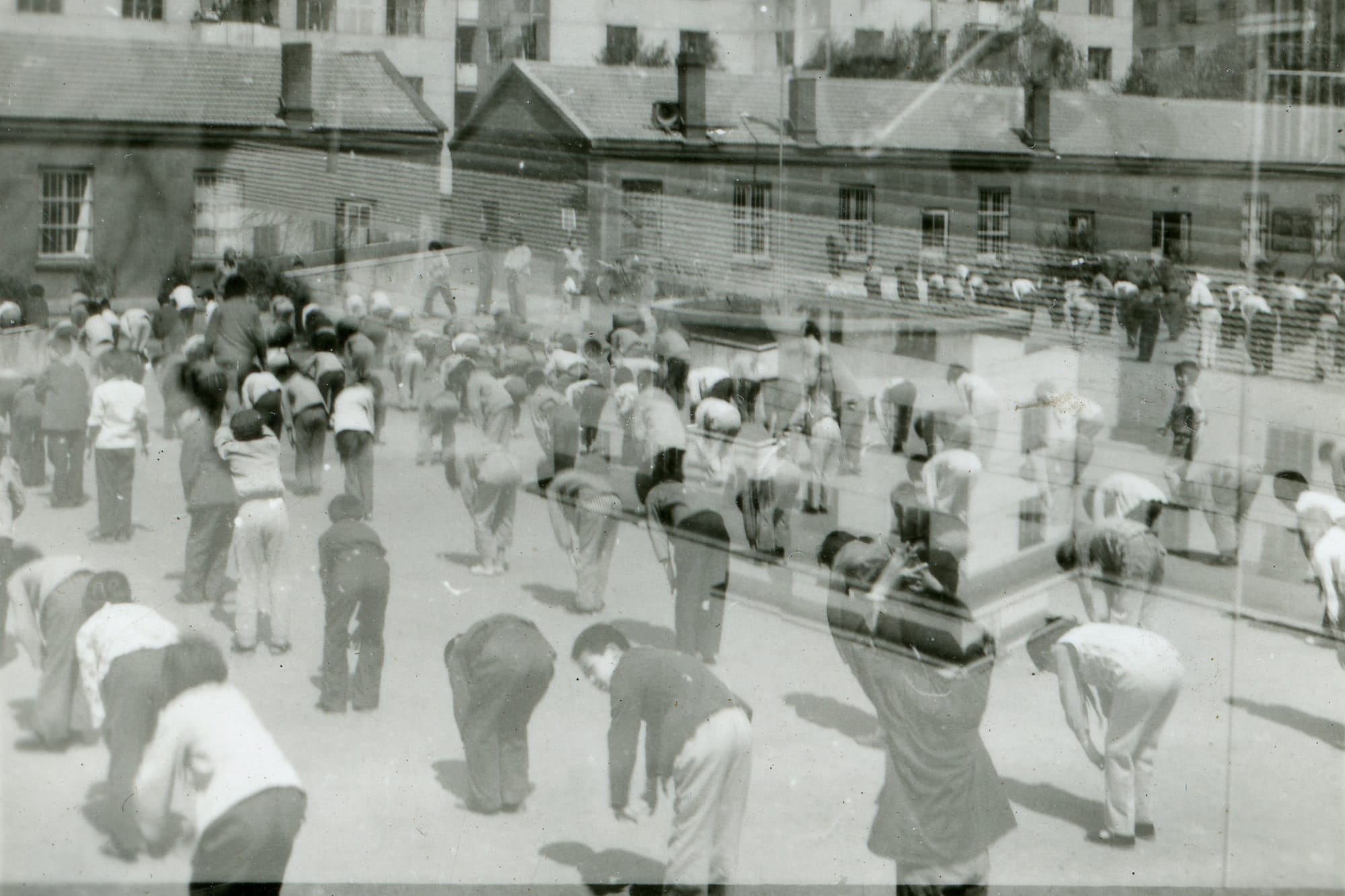 The image constantly shifts. One moment, it’s a string of old photos of buildings passing rapidly across the screen. The next, it’s a slow pan across a black and white Chinese scroll with collaged elements — magazine cutouts of an old bus, an airplane, and several people animated via stop-motion. Sometimes it’s archival footage. Sometimes it’s simply black. At points it even appears to show light reflected off an extreme close-up of a painted canvas superimposed on a landscape.
