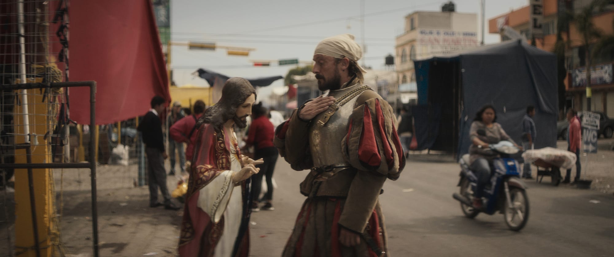 A conquistador of yore stumbles out of the turbulent waves of the sea. A woman's voice informs us that the impossible has occurred: This man is a ghost, the last of the vicious Spaniards who accompanied Hérnan Cortés on his brutal 1521 campaign against the Aztec Empire. He is now in the liminal space between the living and the dead, the past and the present, the colonizer and the colonized. But for what purpose? The nameless conquistador, played by Eduardo San Juan, stalks from the coast to Mexico City, retracing the bloody footsteps of Cortés. Simultaneously real yet intangible, his every action is suffused with magical realism. He tries to bark orders at a group of Indigenous schoolchildren, but his Catholic colonialist zeal halts as he realizes his words no longer matter. So begins 499, a surreal documentary/fiction hybrid by Mexican-American director Rodrigo Reyes. Reflecting on the 500-year anniversary of the Spanish conquest of Mexico, the film’s seemingly disparate elements in fact complement each other.