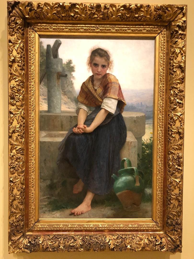 The peasant girls age into early adolescence with “The Young Shepherdess,” (1885), barefoot in a farm field, turning coquettishly toward the viewer. By 1891, the message becomes clearer. “The Broken Pitcher,” shows a pretty peasant girl seated by a well with a broken water pitcher beside her, historically a symbol of the loss of virginity.