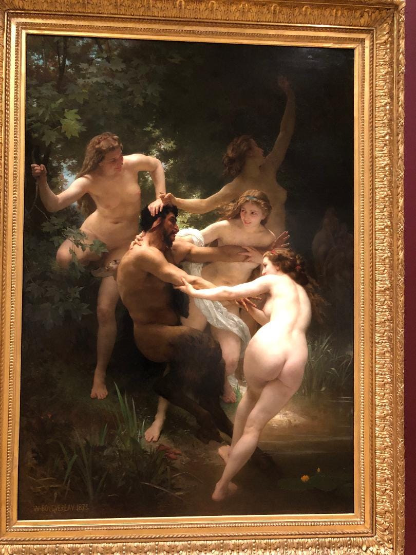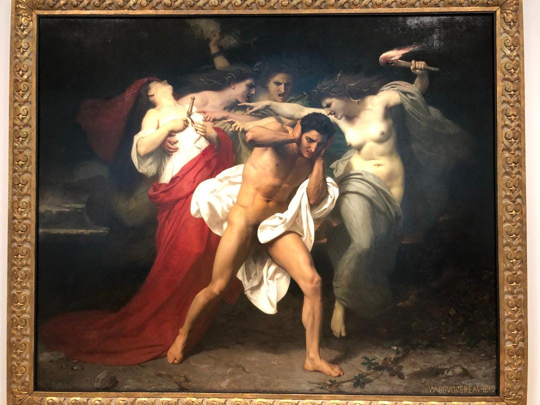 An earlier, similar theme of women taunting a man, “Orestes Pursued by the Furies,” (1862), posits three Furies and the dead body of Orestes’s mother violently enveloping the insane protagonist. First shown at the 1863 salon in Paris, one reviewer called it an “outmoded phantasmagoria.” It later found its way into the collection of Walter P. Chrysler Jr., after the Pennsylvania Academy of Fine Arts deaccessioned it. This is certainly Bouguereau at his best and worst: theatrical drama; a densely interconnected, taut composition; unnatural lighting; seamless paint handling; overwrought expressions; and pale elegance.