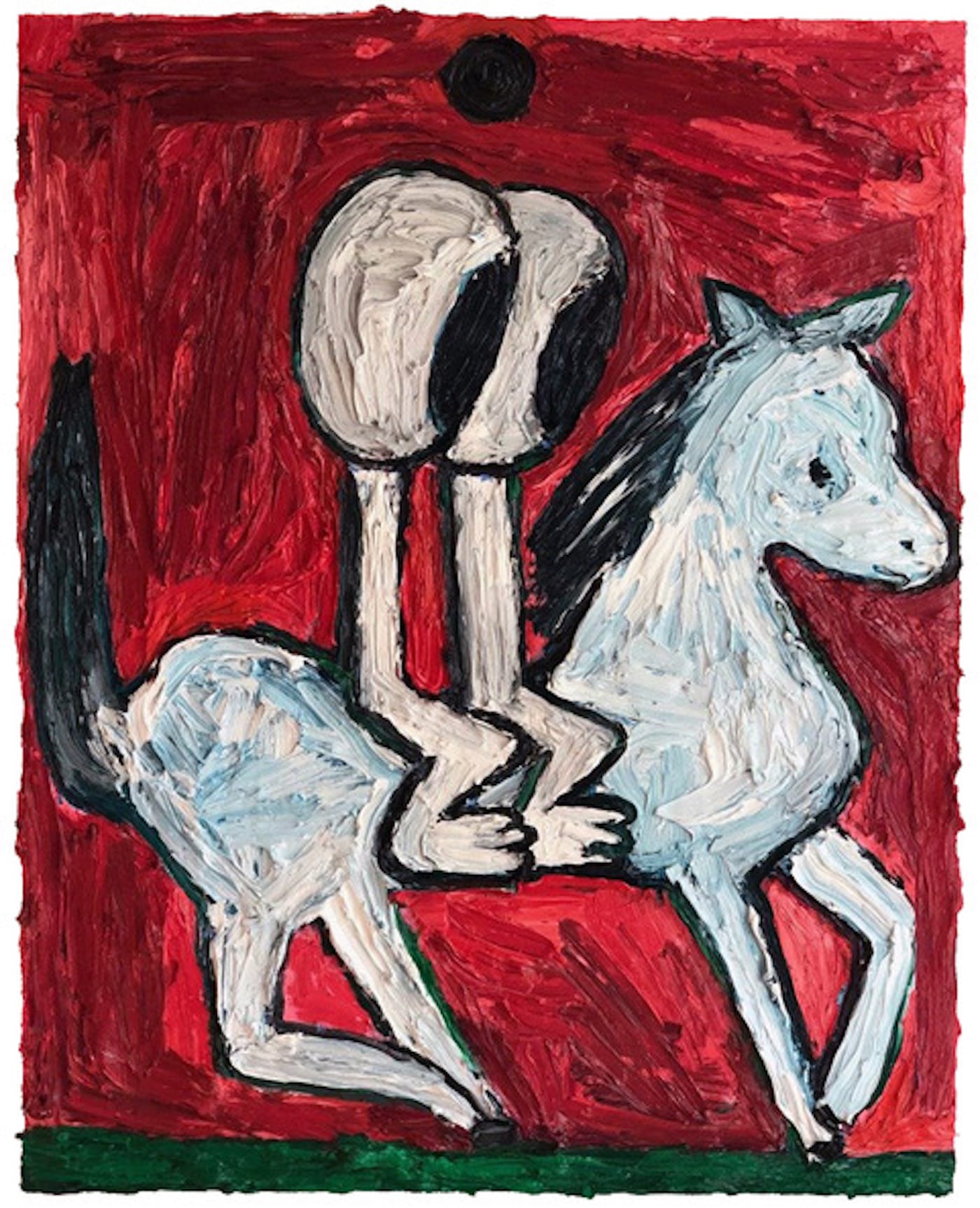 A white orb punctuated with a black pupil appears in several paintings — a motif that the artist adopted after the death of one of her sons. Sometimes a pair of these orbs is riding a white horse; in one painting, they hold each other. In a past interview, Carr explained, “When my son passed, the eye motif became very important and has been dominant in my work. It is a way to communicate my feelings, a way to talk. So this motif comes from the deepest recesses of me.” The angst and loneliness found in other pieces is replaced with a sense of camaraderie and connection between these two eyeball creatures.