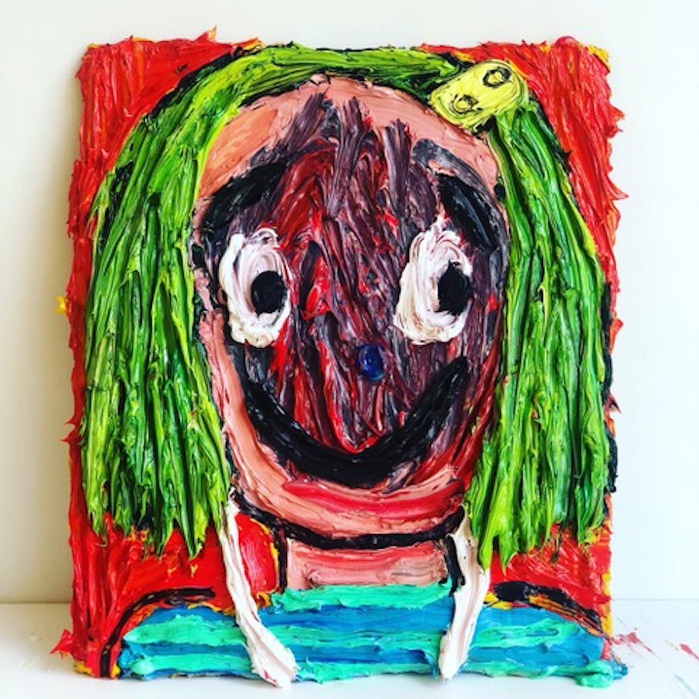 In a portrait called “Ear Plugs,” lime green hair, a yellow barrette, and a blue striped shirt rise up from a red wooden background; black pupils pop out from the whites of the subject’s eyes and a thick black stroke of a smile almost reaches her forehead. The image seems goofy and cartoonish until you really look at the face: the center is red and purple, furiously executed, as if someone had just ripped off a mask hiding an open wound.