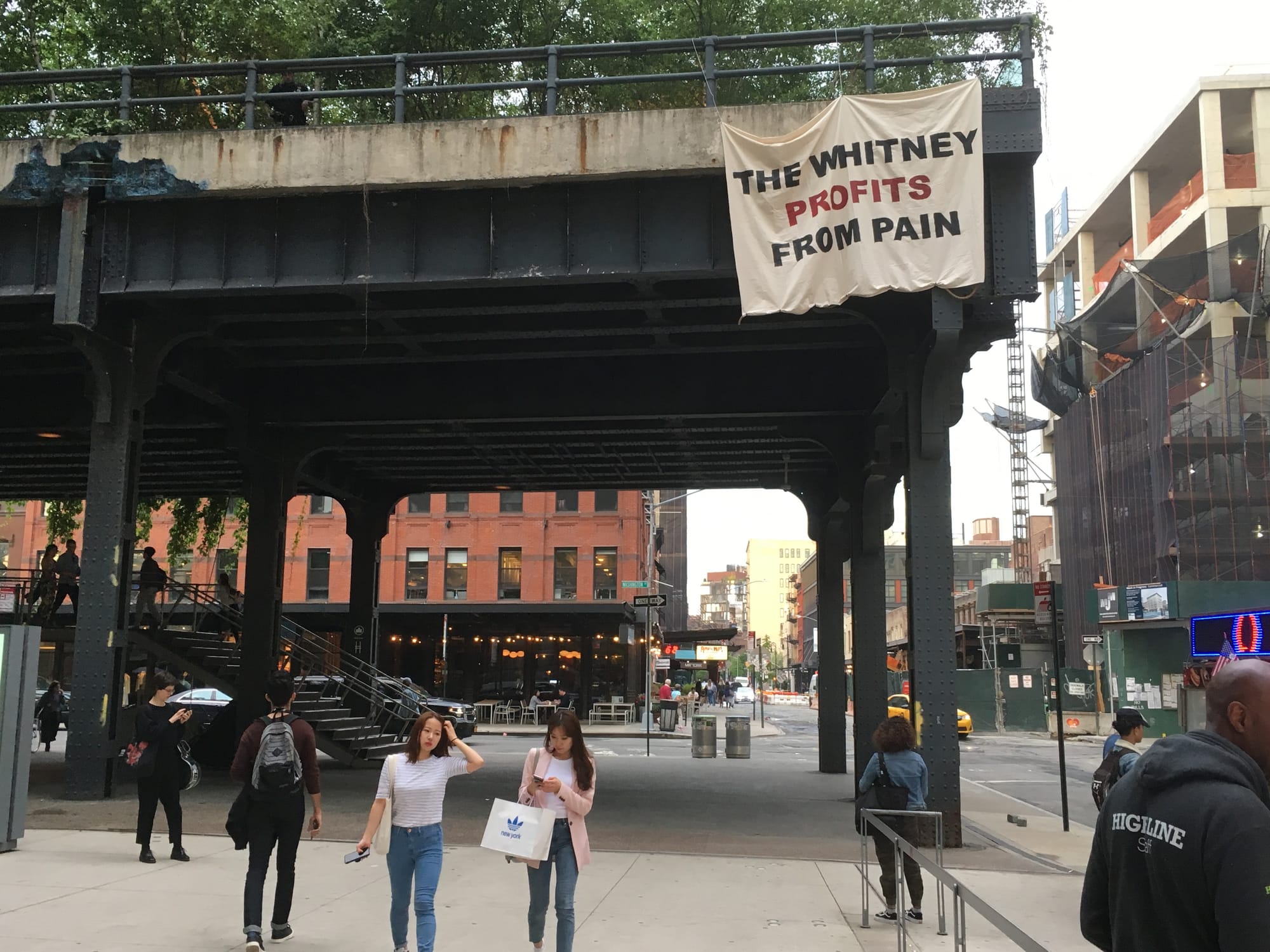 Unlike previous weeks, instead of protesting inside the museum’s lobby, the activists gathered in a subway car, starting at the Euclid Avenue Station in East New York, Brooklyn to protest the rapid gentrification of local communities. The activists then marched to the Whitney to join a group of anti-militarization activists who staged another protest outside the museum.
