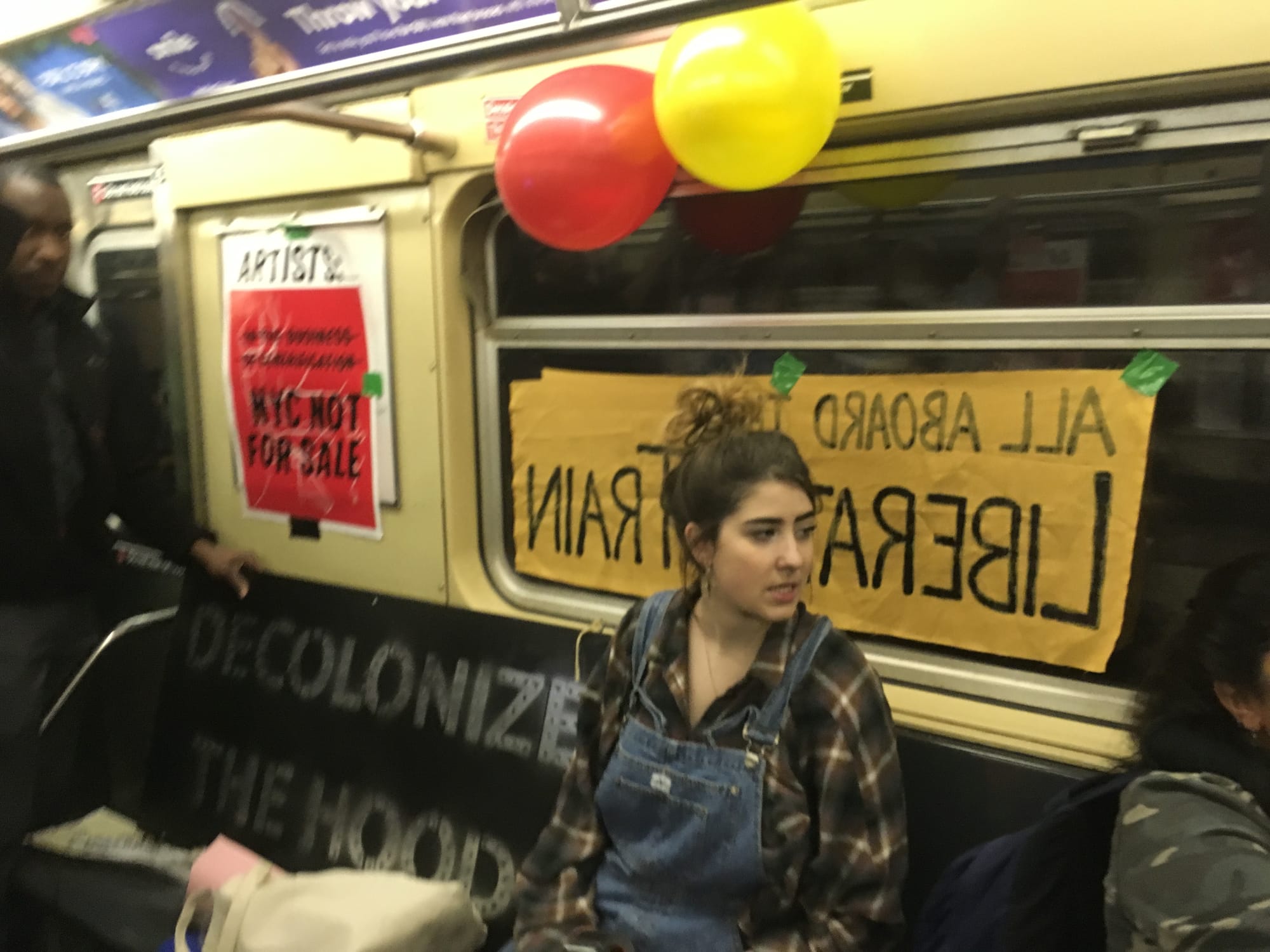 The activists decorated the last car of the C train with flowers, balloons, and various banners, including a sign that identified it as “The Liberated Train.” Members of DTP handed out flowers and flyers to passengers and transformed the subway car into a party bus.