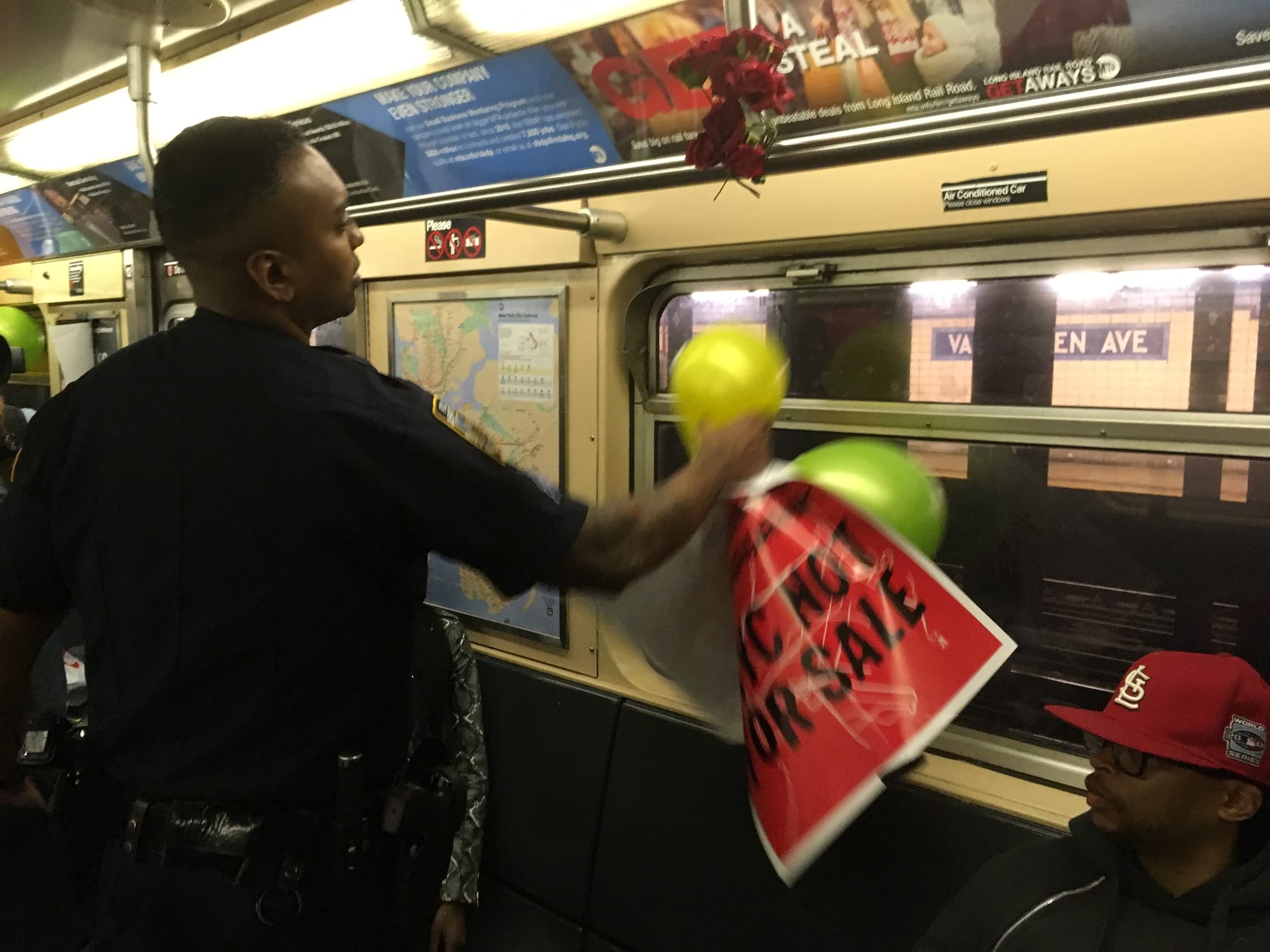 Three subway stops into the journey, at the Van Siclen Avenue station, five NYPD officers walked in to order the protesters to remove their decorations. The exchange devolved into a 15 minutes standoff between the two sides, during which the train was held in place. “If you don’t remove the decoration, we’ll have to do it ourselves,” the officers told protesters. As the activists remained defiant, the officers began to remove the banners, flowers, and balloons and accompanied the protestors during the next few stations.