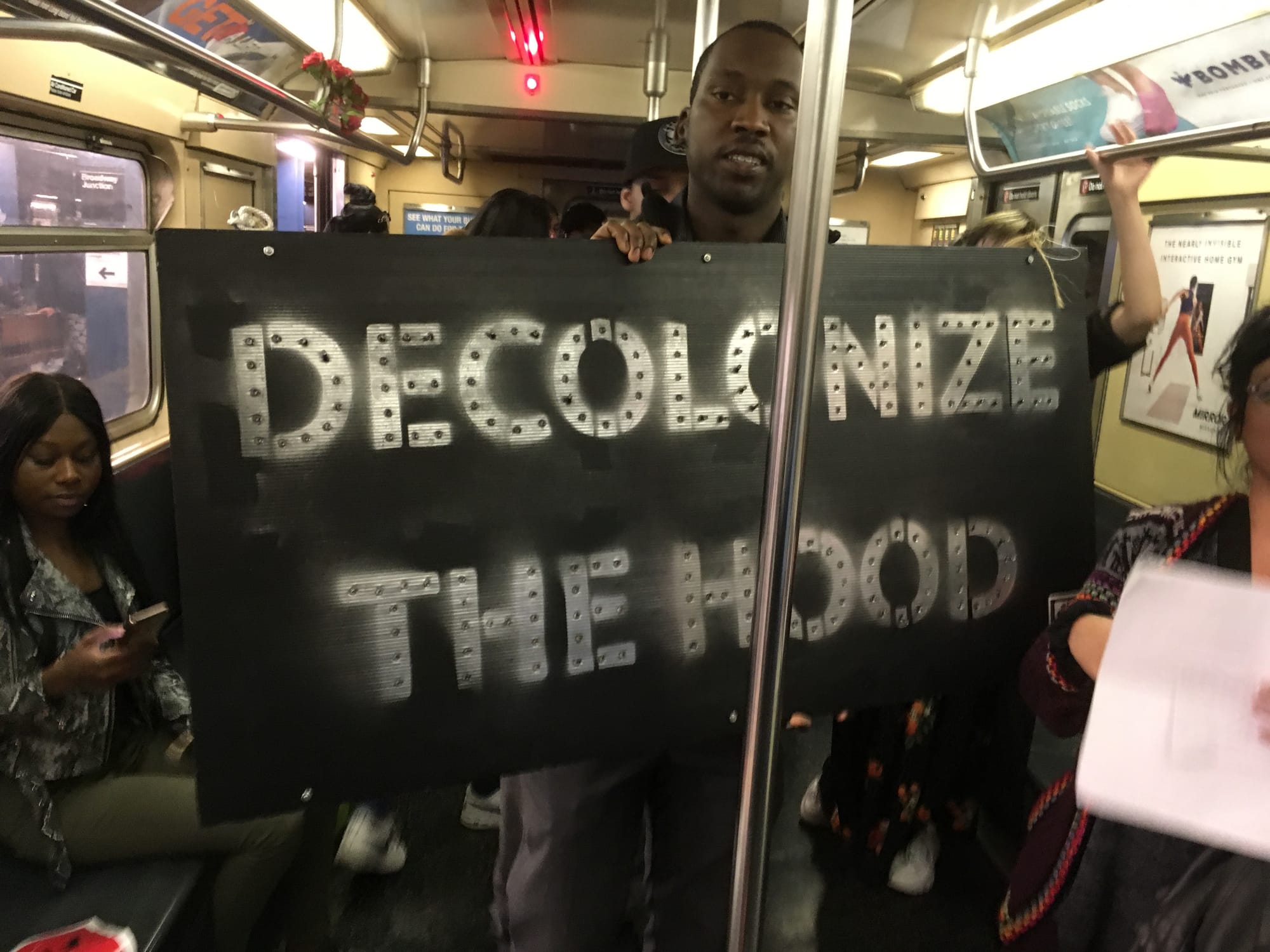 Members of the collective Mi Casa No Es Su Casa from Bushwick boarded the train car at the Broadway Junction station. The speakers described a premeditated policy of displacement and incarceration designed to push working-class families out of Bushwick. “Then white artists came to our hood in Bushwick, and started making murals while we already had art,” the activists said. White artists were encouraged to move into the neighborhood to attract people with higher income, they said. “Now, even those early white artist gentrifiers are being displaced from Bushwick.”