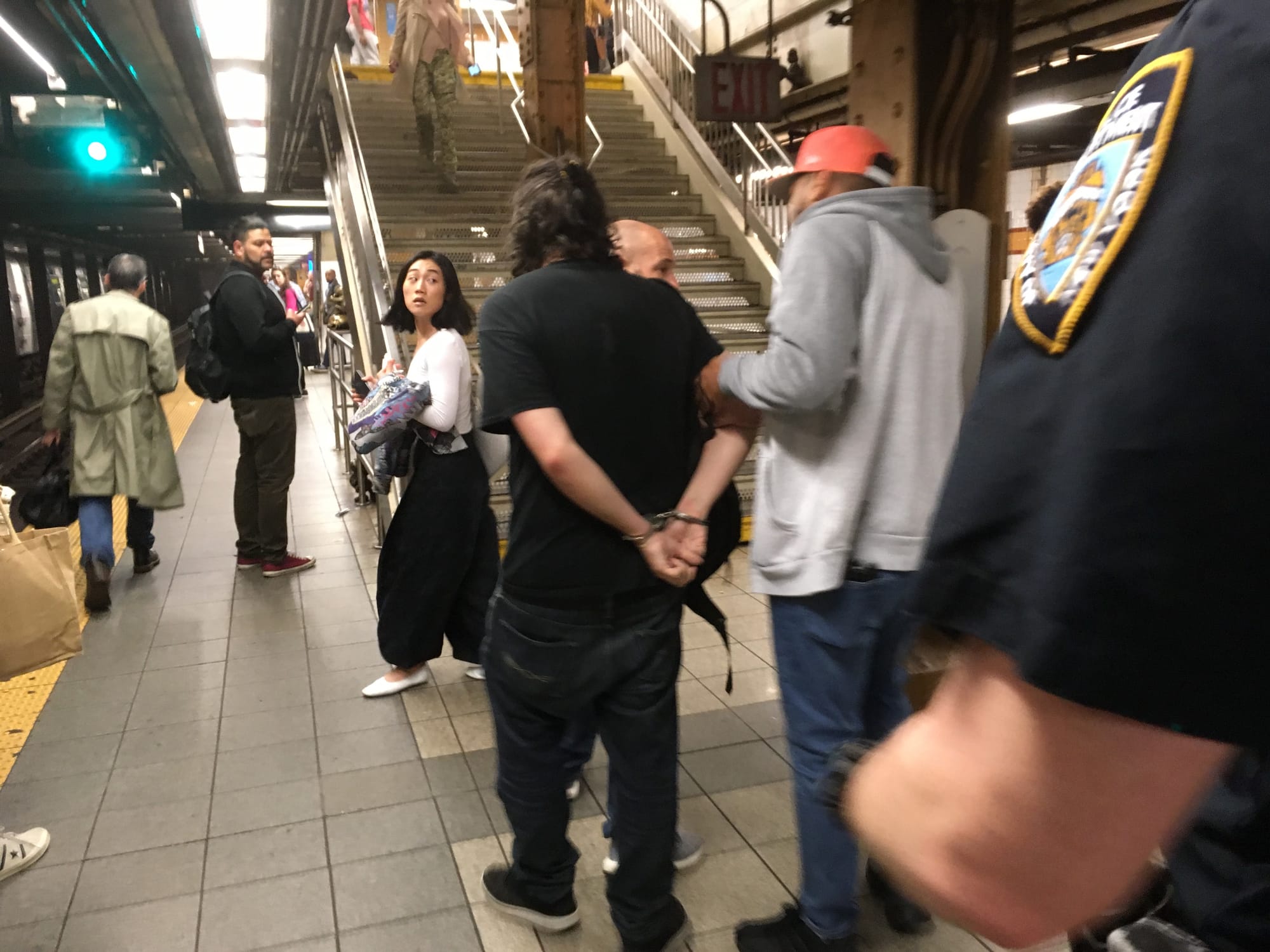 Reaching the end of the C train’s route, the activists exited the train at 14th Street and 8th Avenue and were met with a large NYPD presence. A plainclothes officer immediately apprehended and handcuffed DTP member Yates McKee. The other officers on site did not respond to Hyperallergic’s questions about McKee’s detention. At the time of publication, McKee has not yet been released.