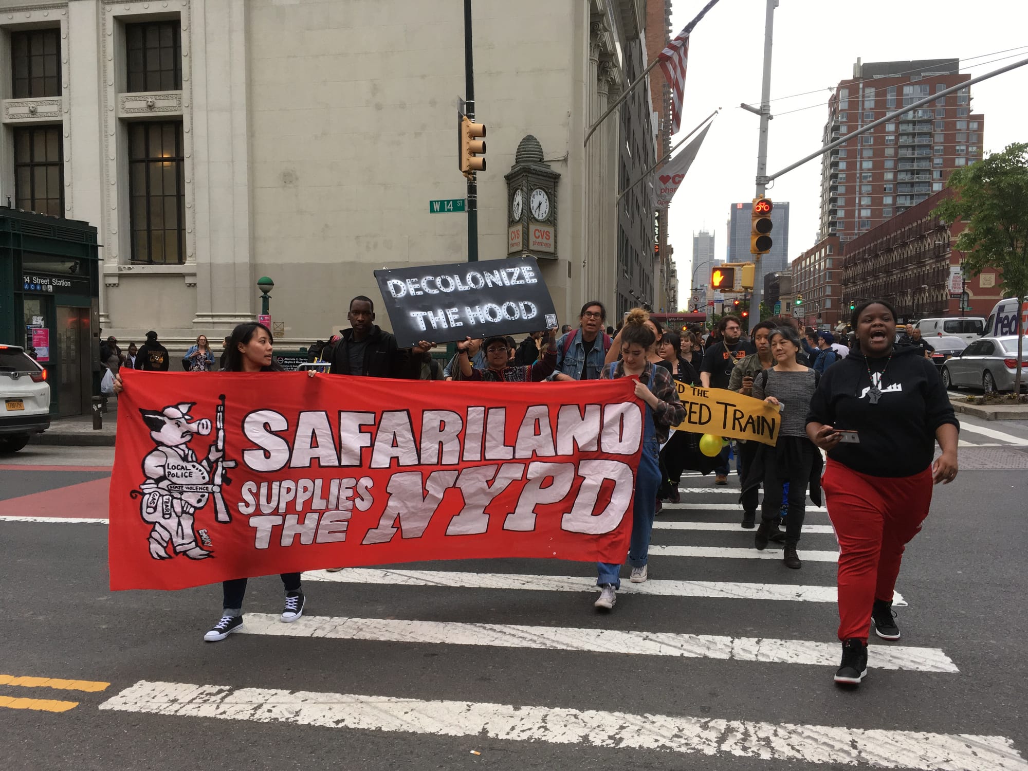 At the Utica Avenue Station in Bedford-Stuyvesant, the group Anti-Gentrification Network narrated the stories of incarcerated migrant tenants in their neighborhood. Explaining that in 2017, Safariland sold $7.3 million of equipment to the NYPD, the activists said: “As the NYPD continues to occupy poor Black and brown neighborhoods, Kanders has helped them to better intimidate us.”