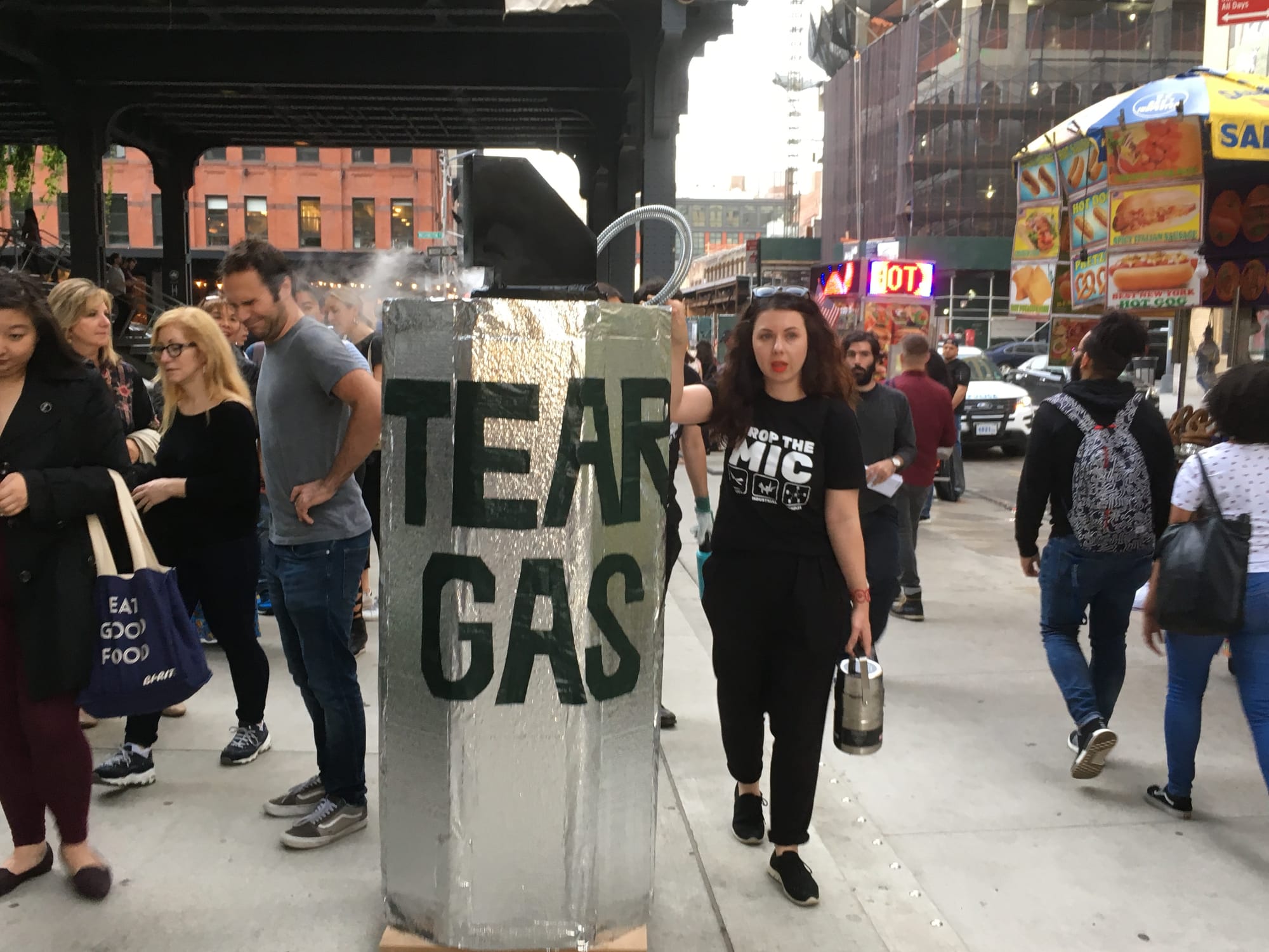 At the Whitney, members of the groups War Resistors League, About Face: Veterans Against the War, and No New Jails were reading testimonies collected from incarcerated civilians who were victims of police brutality, including injuries caused by tear gas.