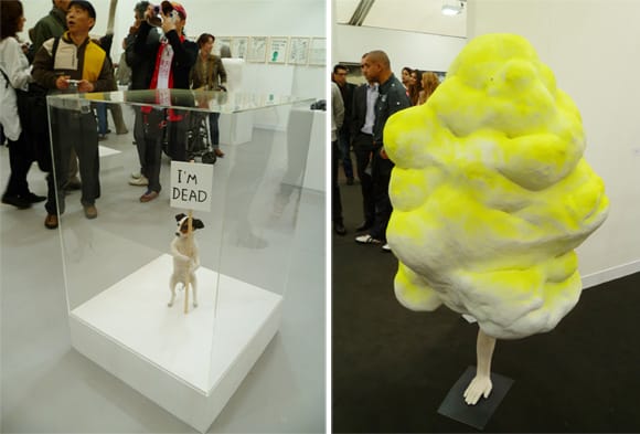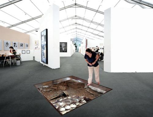 5. Simon Fujiwara’s “Frozen” (2010). I have to say, I’m a sucker for a clever and enveloping installation. Winner of the 2010 Cartier Award, Fujiwara presented a site-specific installation of a fictional Roman archeological dig. Throughout the fair, there were segments of the floor replaced with glass, which looked down into different “sites.” Each was accompanied by museum placards with text giving the anthropological background of the artifacts within, which combined elements of classical and ancient cultures with the modern. My favorite of the series was of a skull, apparently choked by a shoe, surrounded by coins and jewelry. The text details the doomed love story of a female patron and an artist told through fragments of letters found, drawing parallels to the complex relationship art has with money today. Being the only piece present outside of the artist-gallery-collector structure of Frieze, it seemed to also be the only one willing to undermine it. Click here for a map of Fujiwara’s Frieze installation or here for an image of what the final project actually looked like.