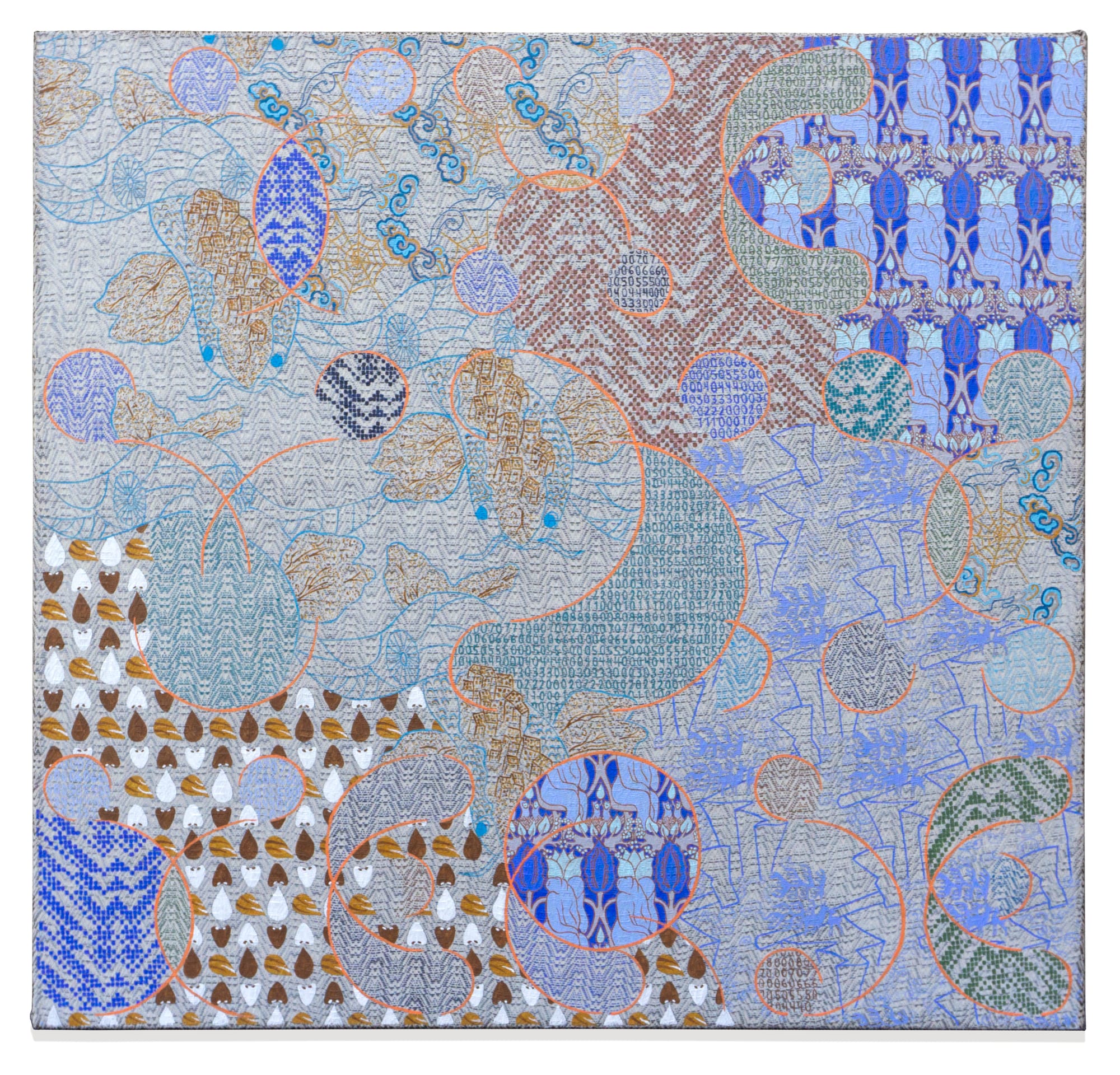 Artist duo Mark Barrow and Sarah Parke explore the intersection between art, craft, and technology through their collaborative weaving and painting practice. This show demonstrates the intelligence of their chosen medium: The artists consider weaving to be a form of thinking that reveals a divine system of patterns. Their hand-loomed textiles and paintings address a range of themes, from creation myths and the cosmos to computer science and the mathematical process endemic to the act of weaving. Among the artworks on view are textile paintings that soothe the eye with tranquil grace and a tremendous vinyl window installation that recalls stained-glass cathedrals.