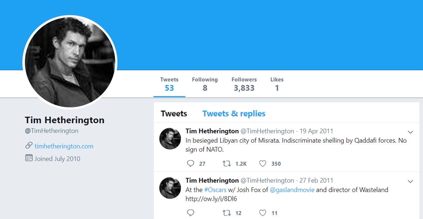 Journalist Tim Hetherington’s Twitter account, still up eight years after his death in 2011, with the last tweet sent the day before he died (screenshot by Hyperallergic)