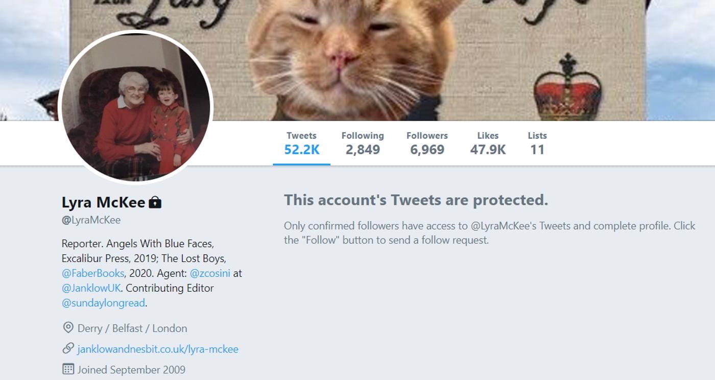 Journalist Lyra McKee’s Twitter account, locked in the wake of her death in April 2019 (screenshot by Hyperallergic)