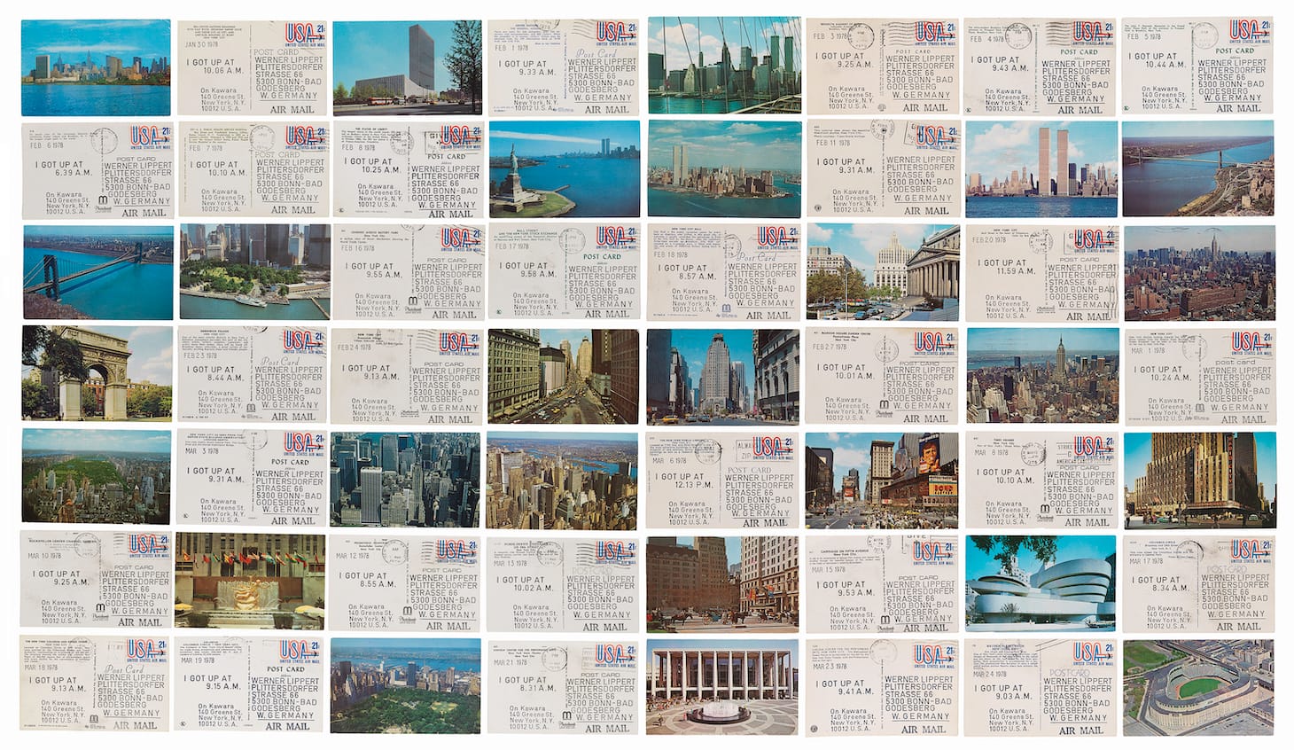 The exhibition snap+share: transmitting photographs from mail art to social networks, at the San Francisco Museum of Modern Art (SFMOMA), reveals that although social media has amped up sharing photos, this urge is nothing new. Clément Chéroux, SFMOMA’s chief photography curator, points to On Kawara’s 1970s I Got Up . . . series, postcards sent stamped with, for example, “I got up at 9:15 a.m.” or “I got up at 8:55 a.m.,” which Chéroux compares to Snapchat and Instagram as a way to affirm our existence. Indeed, the exhibition starts off with a photo a French software engineer sent of his daughter right after she was born, disseminating it through his mobile phone and online network, and then swiftly transitions to the tradition of mail art from the 1950s and ’60s.