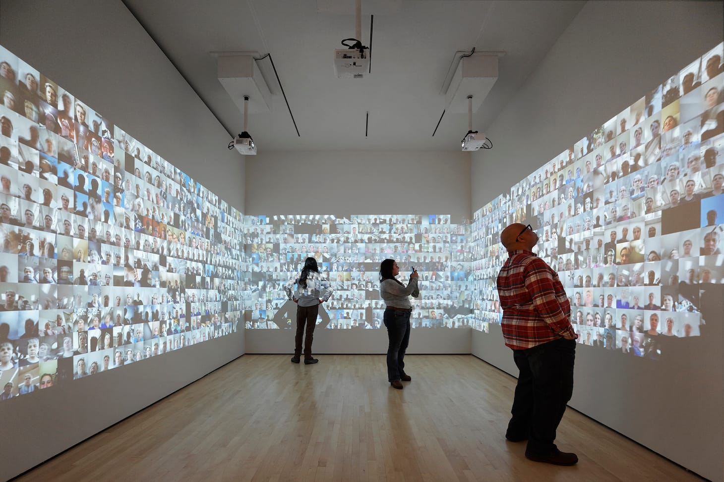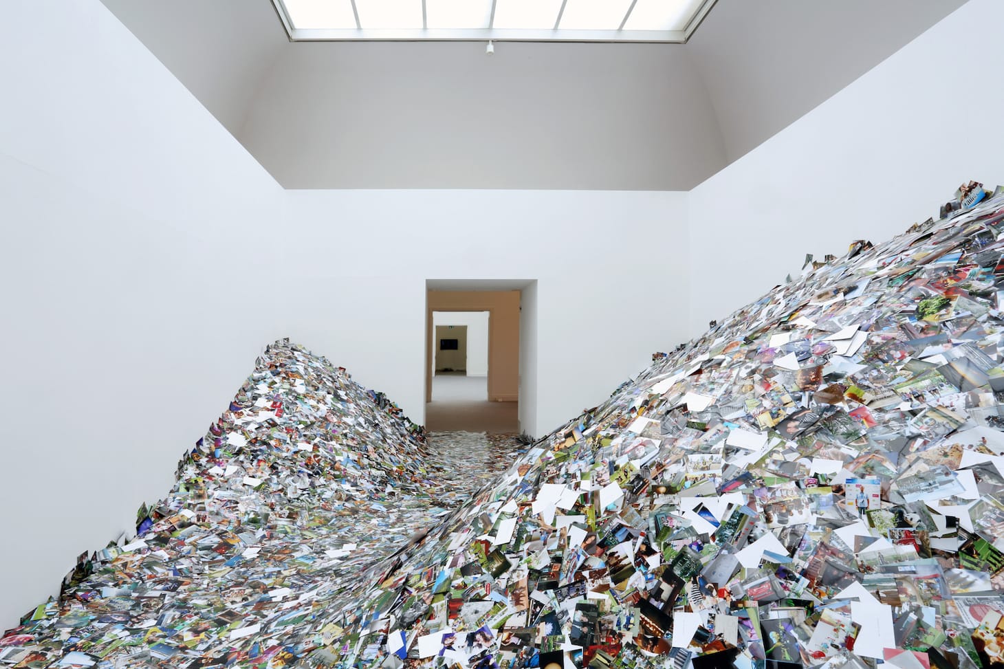 We cross the threshold from analog to digital when we encounter Erik Kessels’s 2011 piece “24HRS in Photos.” Kessels found about a million images were shared on Flickr in a day, and he wanted to show that physically. He printed out the photos, and they’re piled in the gallery with a path for the visitor to make their way through hundreds of thousands of images of pets, fireworks, and babies.
