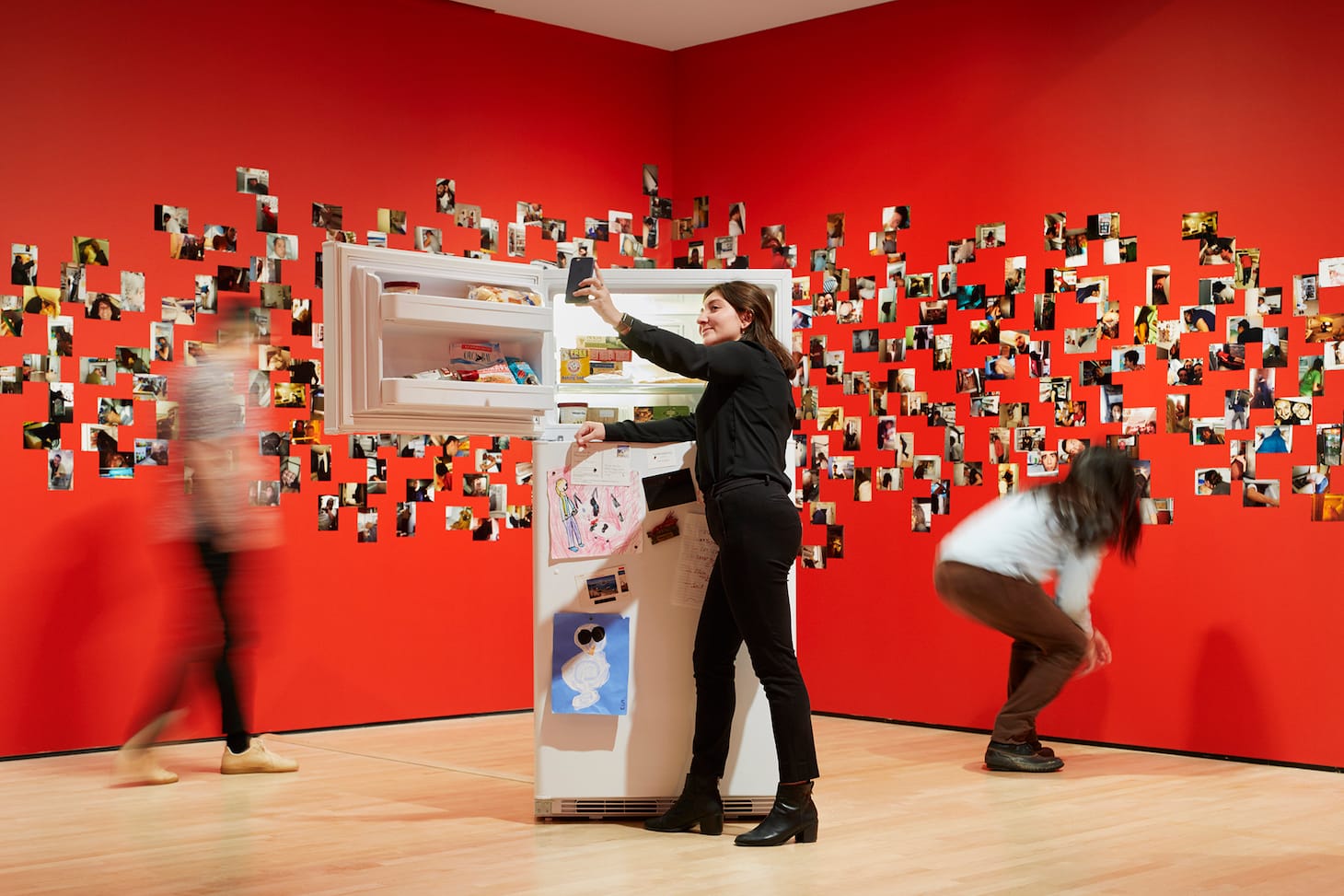 Some people see the cat as a metaphor for the internet — always watching. But rather than looking at the kind of images shared, the curators were more interested in the ways the digital has affected how they’re shared — from quantity and ubiquity to elements of surveillance. Visitors to the show mostly appeared delighted, gasping when they saw the cat peering down at them, happily sticking their head inside the freezer, and oohing at the masses of photos in Kessels’s piece. The exhibit doesn’t invite us to judge or to shake our heads at the addiction to phones and social media. Rather we observe the nature of images and the impulse to share. With or without our phones, we yearn for human connection.