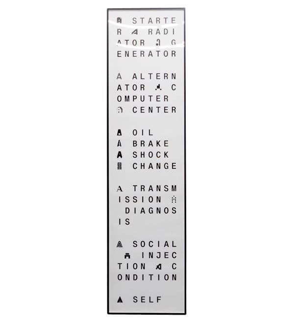 Ebner’s screenprint shows such phrases as “a starter,” “a radiator,” “a generator,” and “a altern/ator.” While the “a” implies singularity and type, the “er” and “or” endings relieve definition of its push toward distinction. This dynamic contrasts with the title, denoting an essentially undefinable entity. The phrases as presented in Ebner’s screenprint could almost be confused, visually, with much of the work of Howe and Mackey. In the record’s liner notes, Ebner writes that she was “drawn to their works for their experiments with poetic form — for their politics of poetic form, to be exact — for their poems’ stray figures and stray errant marks.” In printed poetry, figures and marks are invisible — the bodies of characters, the struggles of protagonists, the references, the narrative, and the sound, at least when read are quiet. Listening to a poet read her work brings these figures and marks into more out into the open, rupturing space around the more tangible sound.