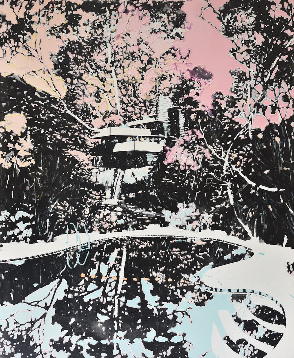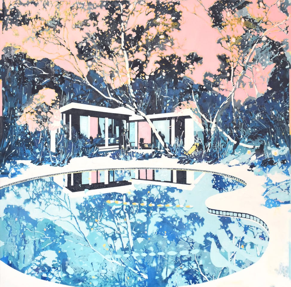 In The Roaring Daze at Olsen Gruin, the expanses of tropical color in Paul Davies’s fictive landscape paintings emanate summery ease. Swaths of canary yellow sky and splotches of pastel pink, tinged with notes of peach and honey, and reflective aquamarine swimming pools, combine to form bright, inviting gestalts. The imagery — composites of the artist’s Australian heritage and adopted Los Angeles environs, layered upon the canvases using hand-cut screens based on photographs — are similarly pleasing: breezy palm trees, stylish Frank Lloyd Wright architecture, picturesque mountain ranges, and alluring backyard swimming pools.
