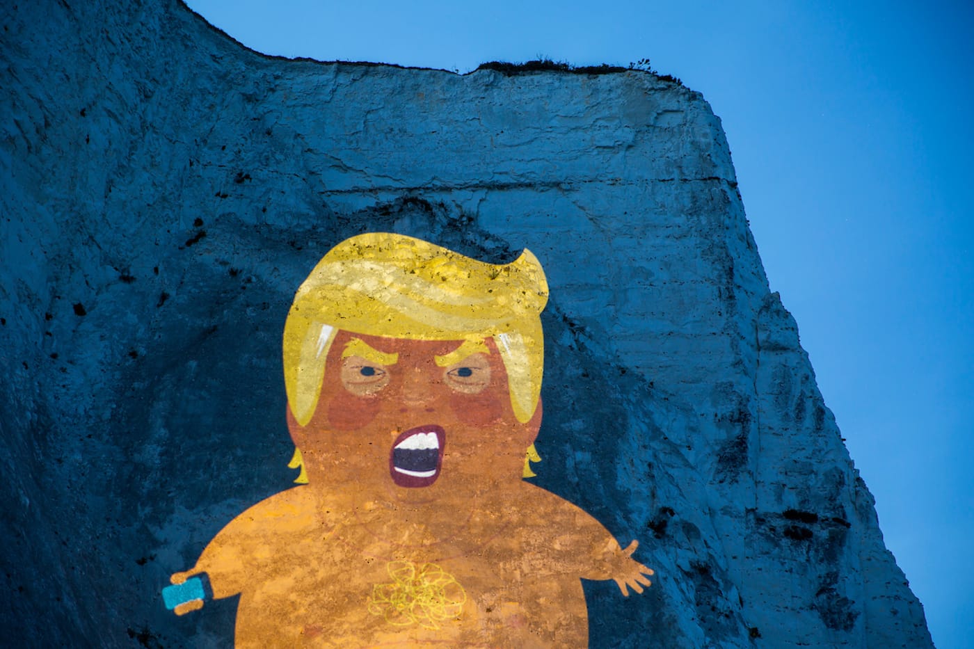 Speaking about the projection in Dover, Bonner told Hyperallergic via email that locals gave an overwhelmingly positive response to seeing the blimp baby on the white cliffs, which is an ecological landmark in Great Britain. The cartoon of Trump Baby looked exactly like its inflatable counterpart, with the president’s signature sneer, a large diaper tied together with a clothespin, a tuft of blonde chest hair, and a phone for excessive tweeting.