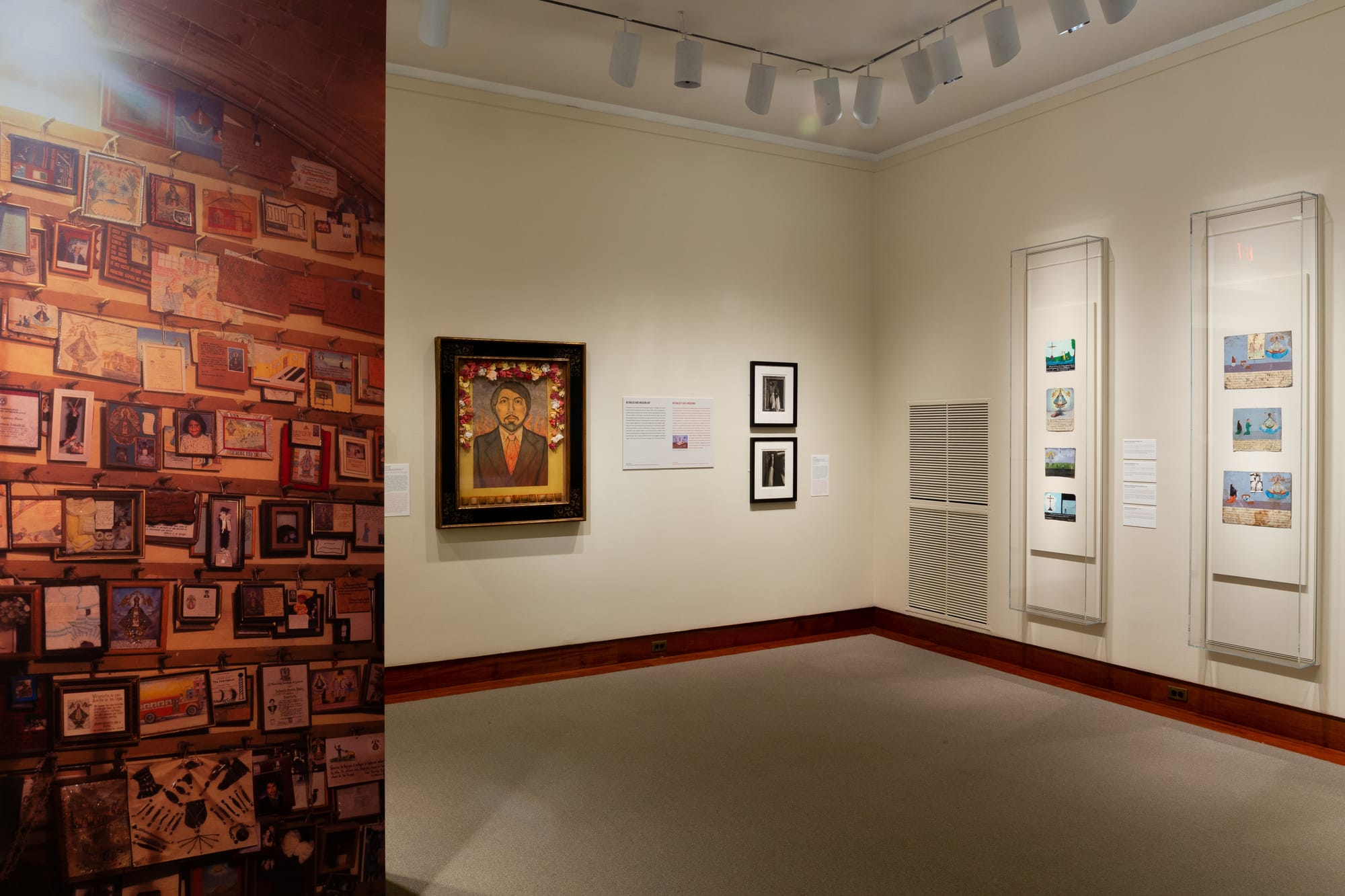 A photo shows how these retablos would be hung in a church, strung from pegs on a wall, fitting in as many as possible, with rosary beads and jewels filling the spaces in between. Over time, older retablos must be removed to make room for new ones. Some churches store and archive them, some sell them, and others leave them for the taking. It should be noted that those in the Massey-Durand collection were purchased from galleries and antiques dealers. Many still have their strings intact, and some have their edges taped.