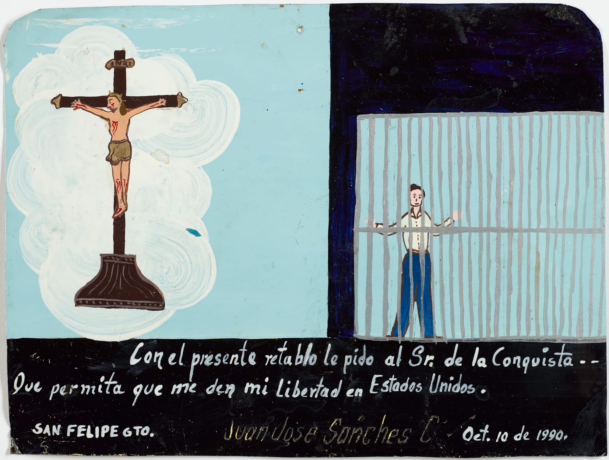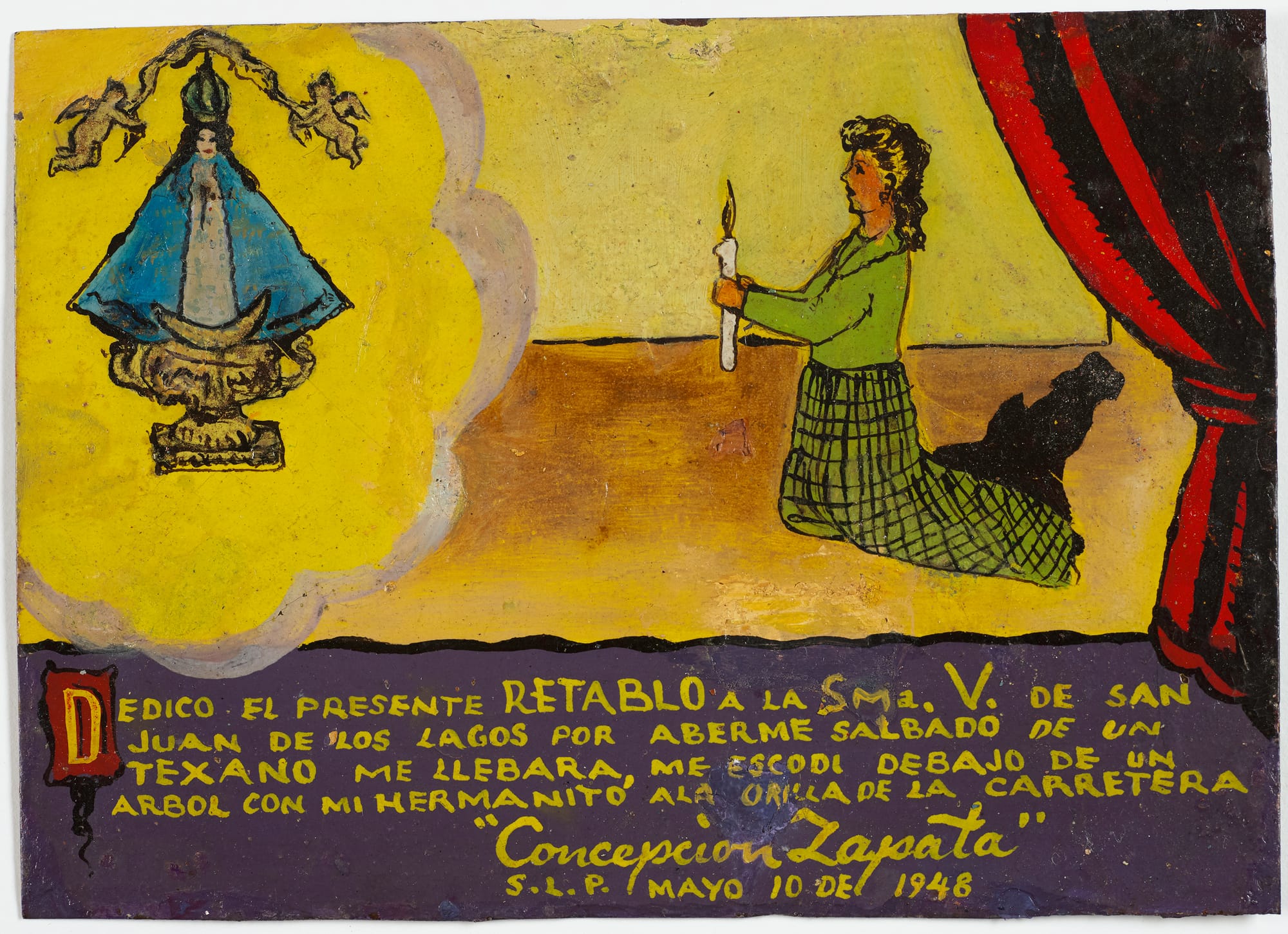 From the Massey-Fiske and Arias-Durand collections, these retablos — mostly from the mid-20th century — tell stories of people crossing the border; the retablos are their gifts of gratitude. In Mexico, retablos — from the Latin retro-tabula or “behind the altar” — have traditionally been placed, as votive offerings, in home altars, shrines, or churches in gratitude for divine protection, and are meant for public viewing. They were usually produced by anonymous artists but signed and dated by the supplicant. Tin was the traditional means of support, although wood, cardboard, plastic, license plates, condensed milk cans, and other scrap materials have also served as substrates.