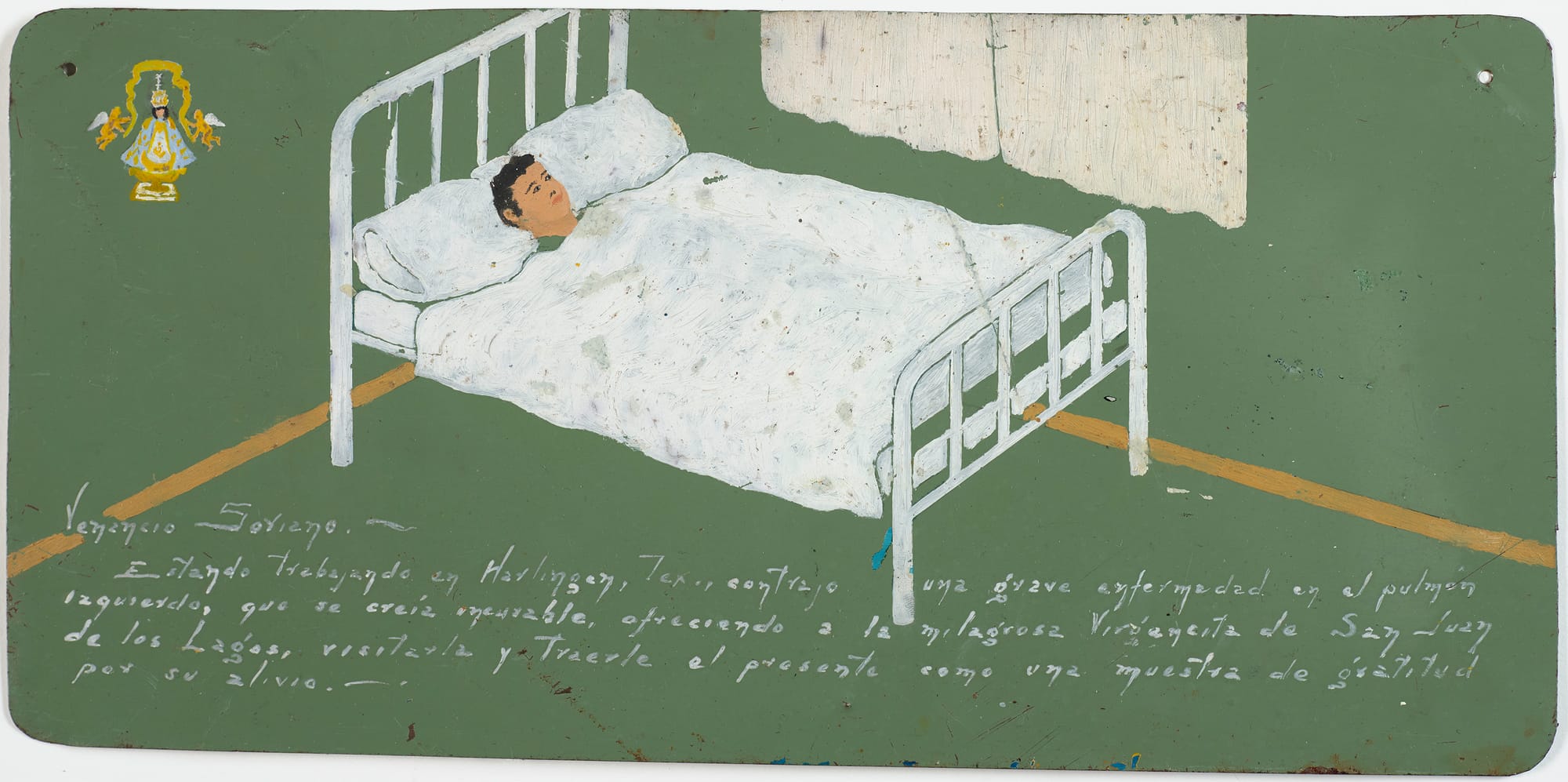 It is generally when every worldly possibility has been explored, to no avail, that one seeks intercession from otherworldly spirits. In one example, a grandmother gives thanks to the Virgin for restoring health to her grandson. A boy lays in a hospital bed while a man in a suit watches over him. Suspended above an ethereal levitating female figure are two cherubs with wings. A black-and-white photo-booth-style shot of the grandson has been nailed onto the painting.