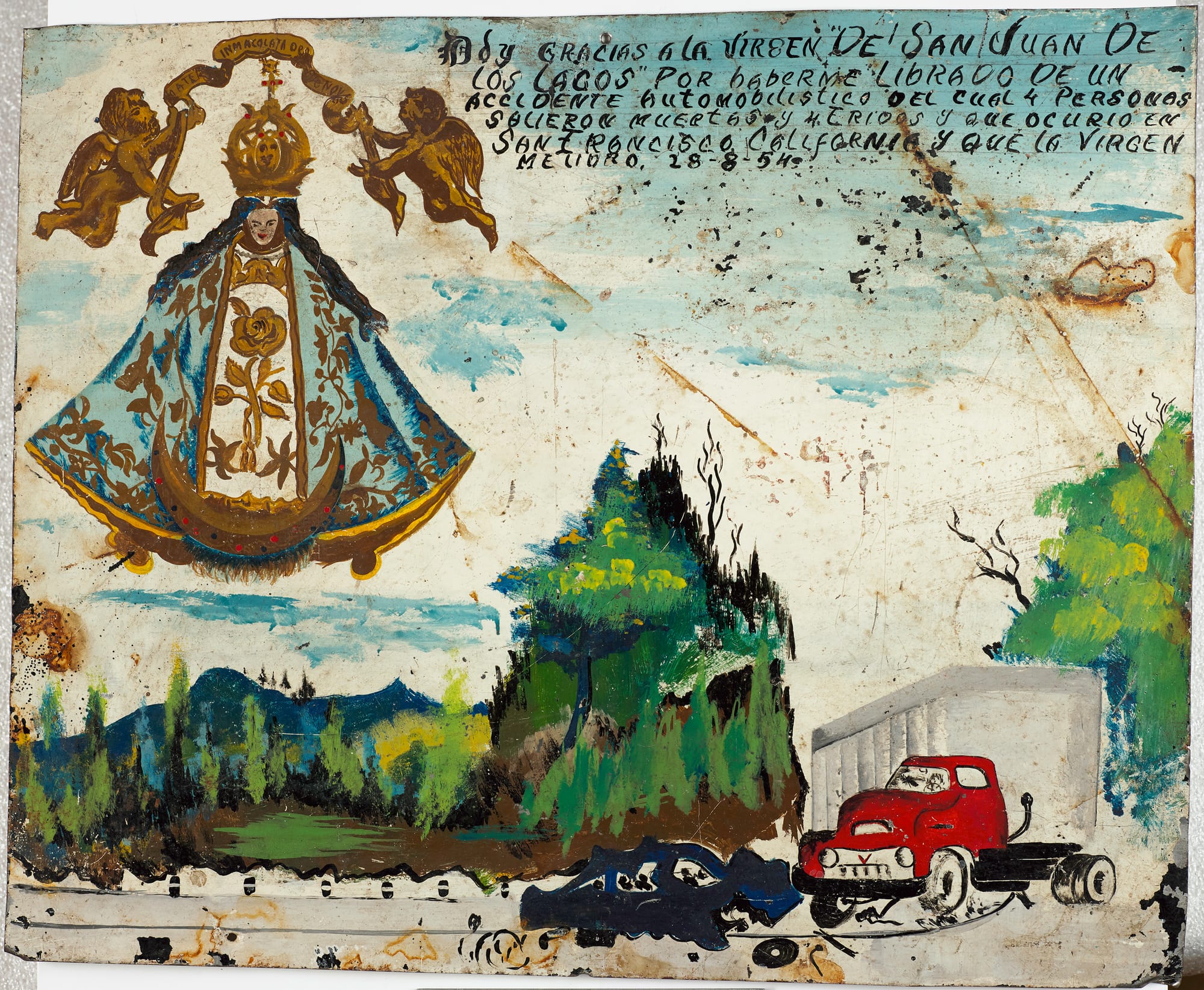 Retablos have their roots in the Catholic churches of Spain from the 12th century on. The faithful prayed to these altar sculptures or paintings of saints for intercession: for example, in healing, protection from danger, or influence over the course of events. These large retablos were replicated on a smaller scale in Mexican churches. There are two types: Santos (images of saints), which were reproduced for home devotion; and ex-votos, made in gratitude for a saint’s protection and donated to the church. The Virgin of San Juan de los Lagos is a distinctly Mexican manifestation of the Virgin Mary, invariably clad in a blue robe. She is frequently invoked for help by Mexican migrants to the US.