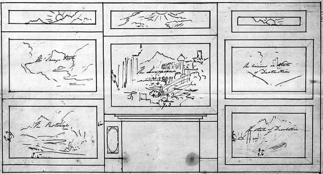 Thomas Cole’s 1833 sketch for the arrangement of the series “The Course of Empire” paintings around Luman Reed’s fireplace: “The Savage State,” “The Consummation,” “Destruction,” “The Arcadian or Pastoral State,” “Desolation” (image via Wikimedia).