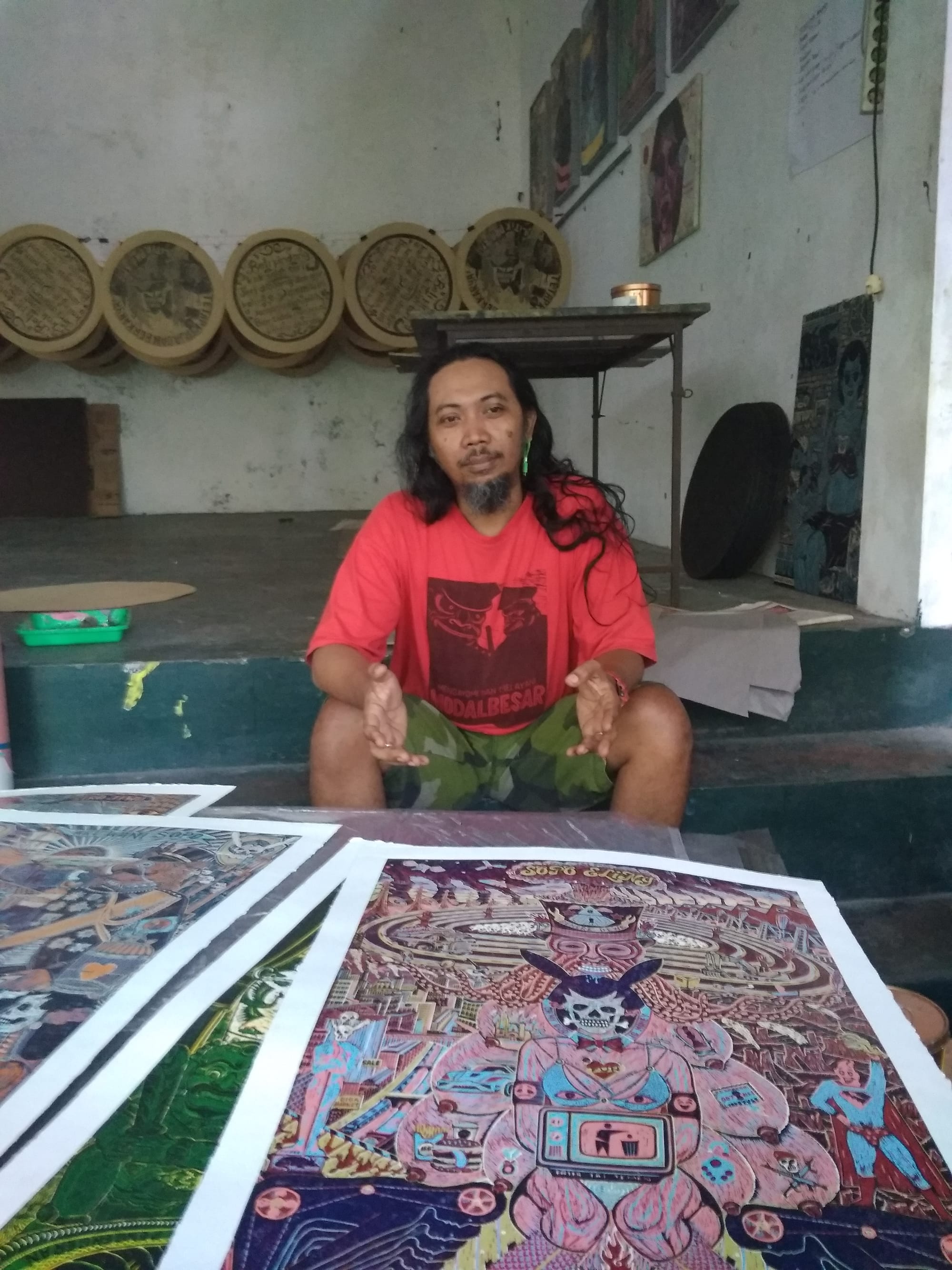 Ucup shows me what he is working on at the moment. Round woodcuts with a format similar to Pennsylvania Dutch hex signs, heavy with text, have been hung to dry on a clothesline. I have seen some of them pasted on hoardings in the city. Indonesia has just held a presidential election, which is always a source of anxiety in a country where the main outlet for information is social media, awash with rumor and hoax. Taring Padi’s latest batch of agitprop addresses the election in the passionate, idealistic, yet indirect style of discourse they have always favored.