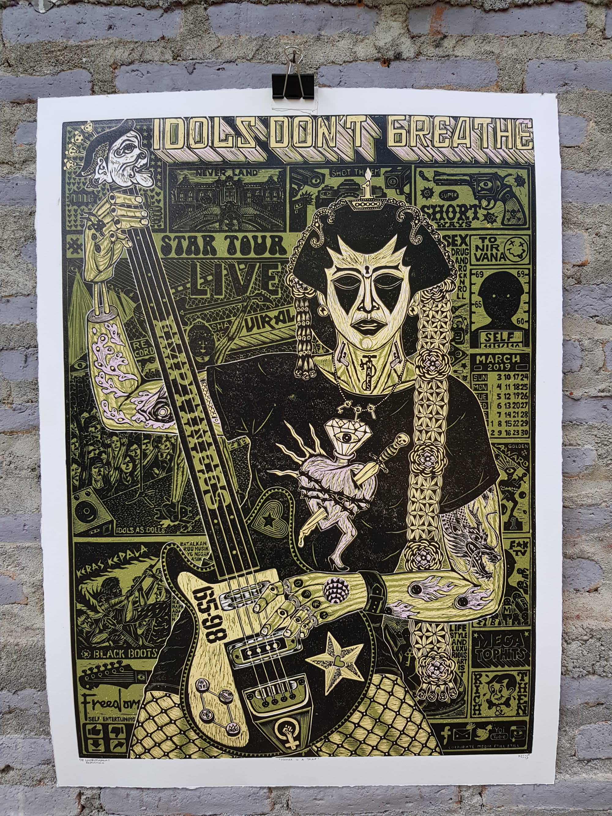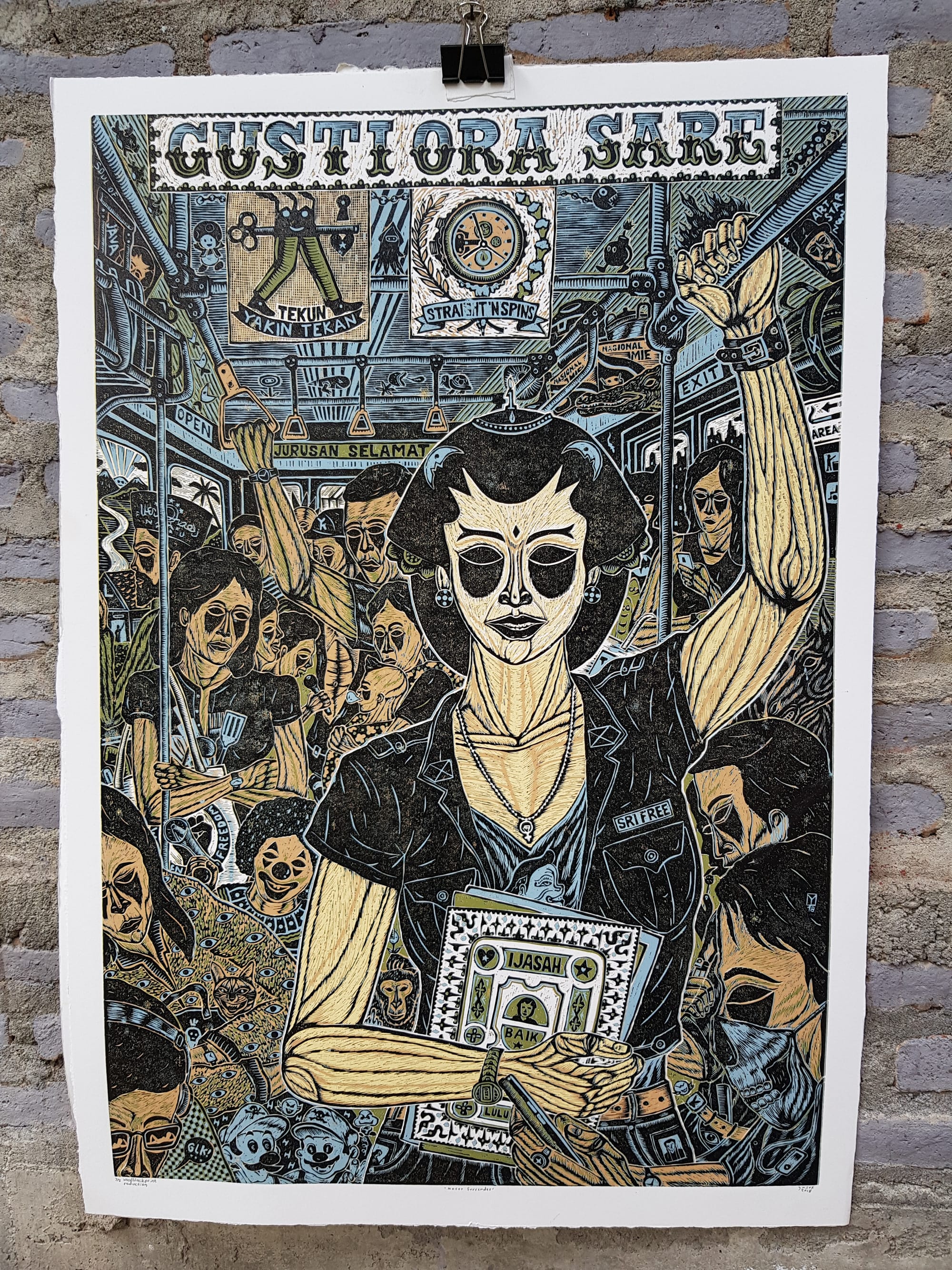 Ucup, “Never Surrender” (2018), woodblock print, 61 x 90 cm.