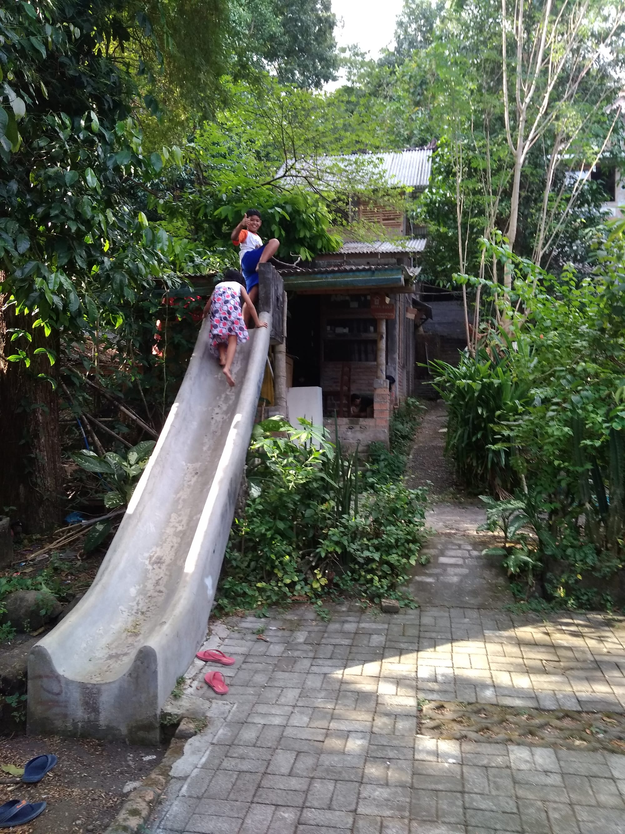 For the past 12 years, Taring Padi has occupied an open-air studio adjoining a two-story frame house next to Ucup’s own home in Sembungan, a village on the outskirts of Jogja. Like many villages in the conurbations of Java, it is tucked away off a busy highway jammed with overloaded trucks. Turn down a narrow, shady lane, lined with simple tin-roofed houses, and you quickly find yourself in a tropical forest of soaring bamboo and fragrant pines. The most prominent feature of Taring Padi House is a 20-foot-long cement slide for the children, in front of the house. When I arrive, a half dozen boys and girls abandon the slide and crowd around me, leaping with excitement to have a foreign visitor, and lead me up the hill to meet Ucup.
