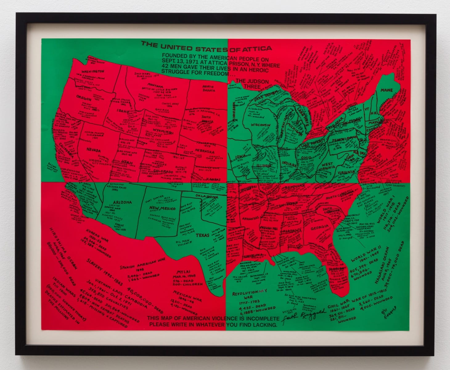 The legendary Faith Ringgold opens the show with paintings from her series Coming to Jones Road, which tracks the narrative of slaves over the course of 200 years. Her beautiful, splotchy paintings of leafy forests and dusty paths are fully rendered, but essentially blank; they are scenes that are vacant of people or context save their visceral, ultra-saturated palette of greens, blues, and (especially intense) reds. If these works are haunted by the specter of an untold past, “United States of Attica” brings history to the fore with a bolt of righteous anger. Using a map of America (in the colors of Marcus Garvey’s pan-African flag) labelled with the sites of riots, massacres, terrorism, and genocide against Black and Brown people, Ringgold probes the limits of a country too wedded to its own myths to broaden its sense of home and include its rightful heirs.