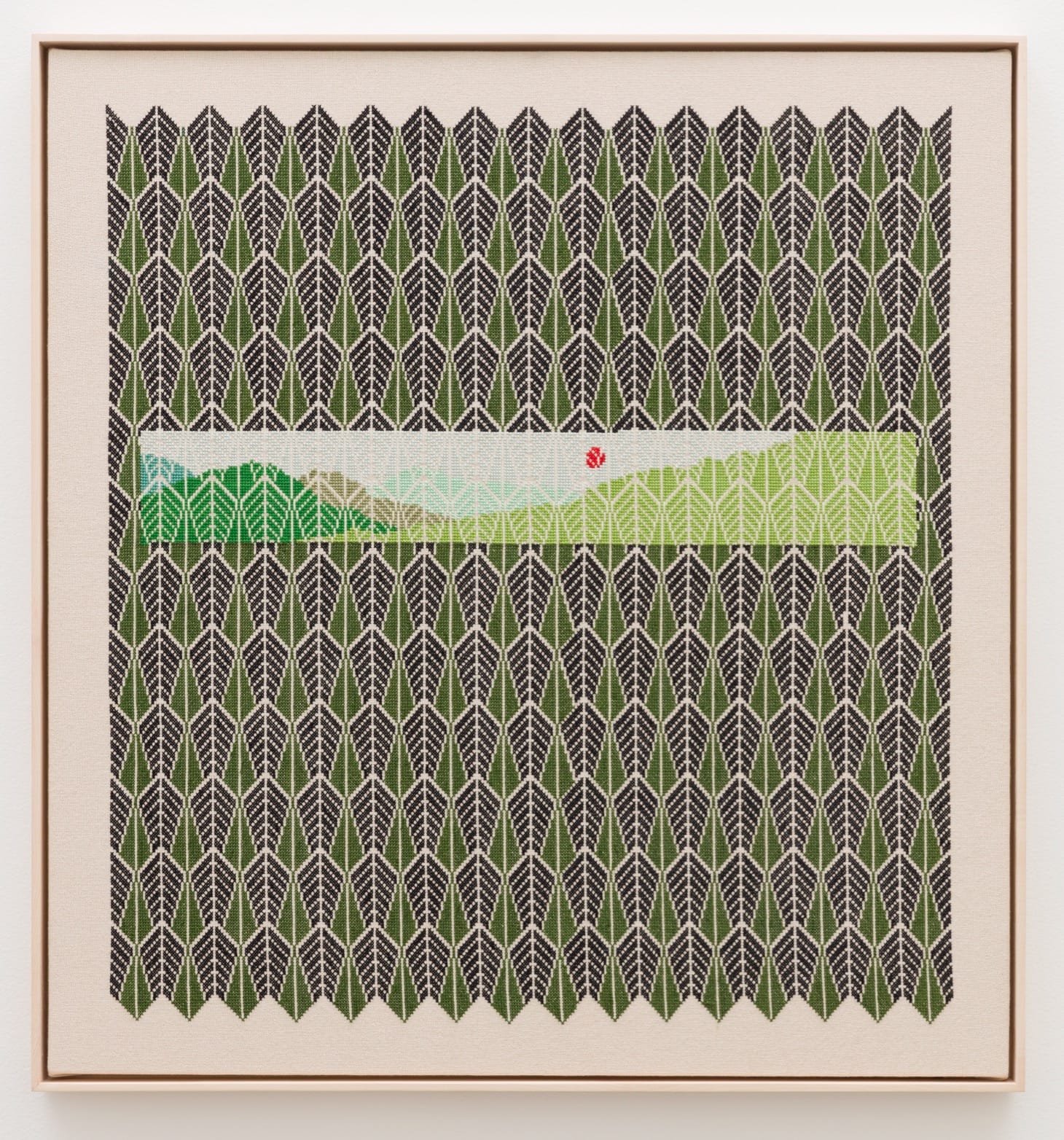 Jordan Nassar’s gorgeous hand-embroidered canvases marry the technical skill of a master craftsmen with the poetic eye for color and geometry of Etel Adnan. His work conjures sun-kissed and moonlit landscapes framed by Palestinian design motifs — culture as a constant window to look out upon and consider the world.