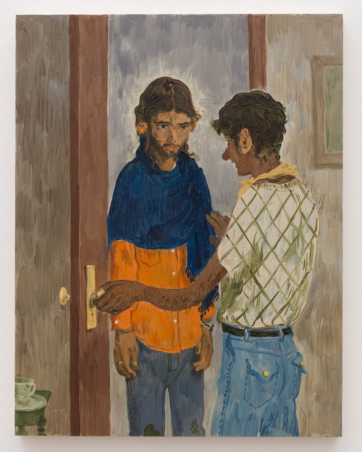 The freedom of Salman Toor’s paintings stems from the rush of finding home in the kindness and shared sensibility of other people. His portraits of young, queer men unfazed and unfettered by the world in the glow of each other’s physical (“Three Boys” [2019]) and digital company (“The Texter” [2019]) are breathtaking. But for the joy of his unbothered subjects, Toor is also adept at probing the subtle, emotional currents that churn beneath a home’s cozy aura. The gorgeously open-hearted “The Arrival” (2019) reveals the impetus for seeking home in other people is often dispossession from one’s own kin. Toor’s graceful hero embraces him any way.
