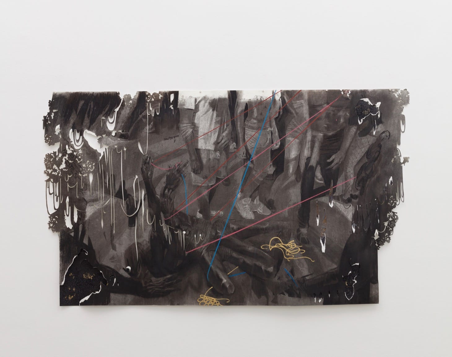 Cosmo Whyte’s piece, “Tethered” (2019) buckles down on the ambient dread that Ringgold hints at in her paintings. Cut out along the edges into forms evocative of Kara Walker’s silhouettes, Whyte’s drawing depicts a flailing man in a thrum of faceless people. He is either breaking free from his circumstances or succumbing to them, either materializing into a person or fading into the ether.