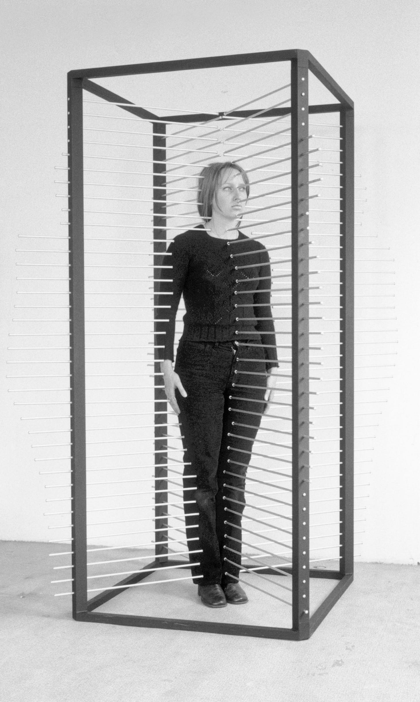 Likewise is the love/hate heat in the peek-a-boo driven “Feather Instrument” (1970) costume, filmed in use in the mesmerizing Performances 1 (1970–1972) film. Here, an idyllic, young naked man’s hairy body is peeked at by two young women as they lift and drop the white feathered blinds of his box garment by pulling the strings. Following Horn’s 1970s performances with body extensions, masks, and feather objects came her first kinetic sculptures that were featured in her films.