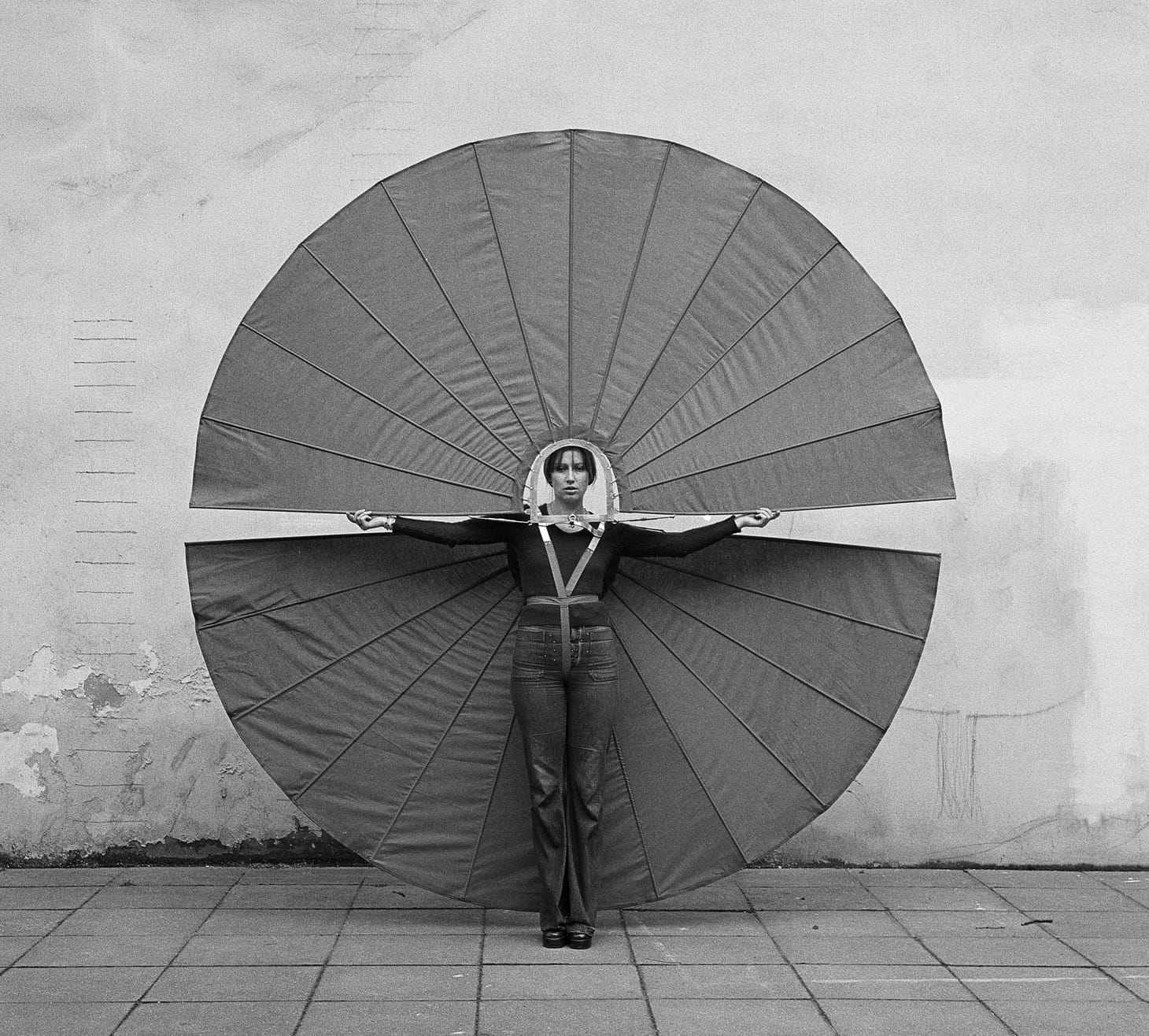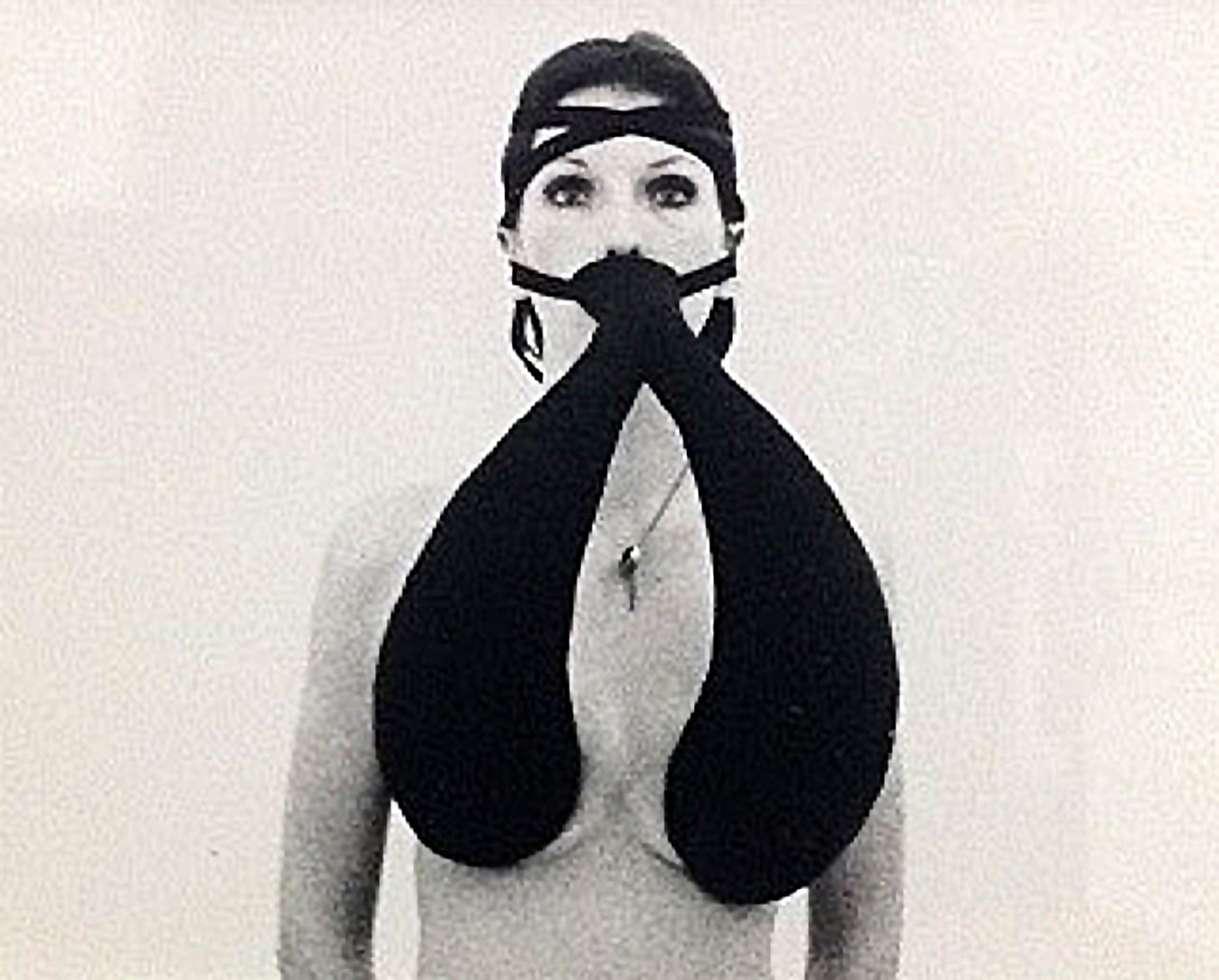 In general, Horn’s work sits staunchly between the lurching horns of Georges Bataille’s brand of mystical Surrealism since it is magical, excessive, and overwhelms binary divisions. Her encyclopedic artistic references (or parallels) are always transgressively erudite, and when not supplied by the curators (the case in Basel) come to mind on their own: Loie Fuller, Yvonne Rainer, Alfons Schilling’s body/vision extenders, Vito Acconci, and, of course, the early body-centric work of Bruce Nauman. But especially like Fuller, Horn’s image techniques are magnificently burlesque and technical in a (perhaps) female way. Even though Horn would certainly reject the binary category of male/female, her work often opens up folded flaps to bare something, as we see in the iconic Achim Thode photograph of Horn’s “Mechanical Body Fan” (1974–75).