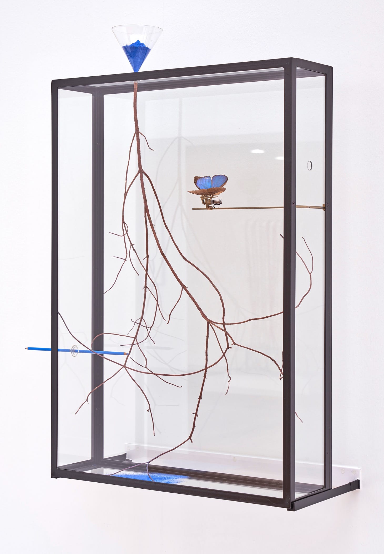 In the Basel Body Fantasies show, Horn’s radical body-centric work provokes imaginative thought in another way by presenting as similar the cadenced nature of both sexual action and mechanical repetition, thereby suggesting a sense of transcendental timelessness. With the beautiful “Butterfly Body Fantasy” (2009), Horn’s gorgeous, non-stop, mechanically fluttering butterfly box, her work takes on a Joseph Cornell-like mythical inference, but even more crammed with exquisite subtleties. Its motorized, iridescent, blue morpho flapping wings lured me into an infinite private tumult of contradictory impulses that never stop fluttering.