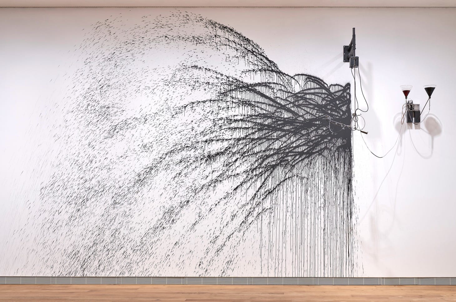 As a painting-machine and painting, “The Lovers” verges on the exuberantly preposterous. As such, it is perfect for schadenfreude lovers ravished by weariness and woe. Turning the corner and discovering the lovers in flagrante delicto, and approaching this enormous spray-drip piece for a better look creates a jolt of self-conscious connection/disconnection that lifts both sex and painting out of their superfluous state of sluggish, solipsistic melancholia. It is a mechanical sex work that mixes black, oily-looking ink with pink champagne, and thus touches on the many facets of the human-as-machine condition: love, power, conflict, sexuality, surprise, luxury, loss of control, autonomy, intoxication, ejaculation, and internal strife. “The Lovers” is a juicy receptacle for an artificial intelligence fever dream, disrupting and shaking up what is boringly cliché about the love of hand-made painting.