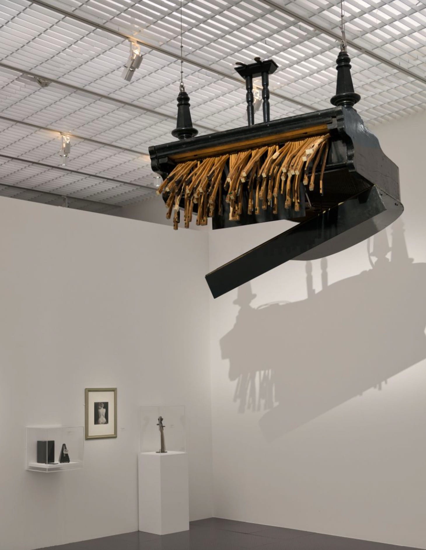 As a result, throughout Theatre of Metamorphoses, there is more artistic density and adventure than at any other one-person show I have seen so far this year. As example, just by considering Artaud’s run-amok drawing “The Machine of Being” (1946), placed near Horn’s hung, inverted, slow moving, guts-revealing piano “Concert for Anarchy” (1990), the desire to experience all art objects as weird fluidity and fluctuating ambiguity is enhanced.