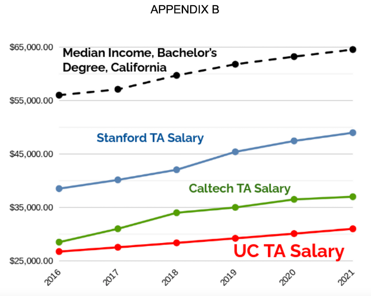 1There is a large gap between the TA salaries at UC and other institutions in California. At Caltech, TA’s salary is over $37,000 while at Stanford, it’s over $50,000. Furthermore, their PhD students in Art and Humanities also receive a much more affordable workload. At USC, PhD students receive an annual stipend of $30,500, with similar benefits but no teaching required for the first 3 years. At Stanford, PhD students only have to TA for only four courses during their time at the university. In addition to the stipend, each student also receives a one-time payment of $6,000 for the first two summers in addition to $7,500 for dissertation research. For more information about the data, please see Appendix B.