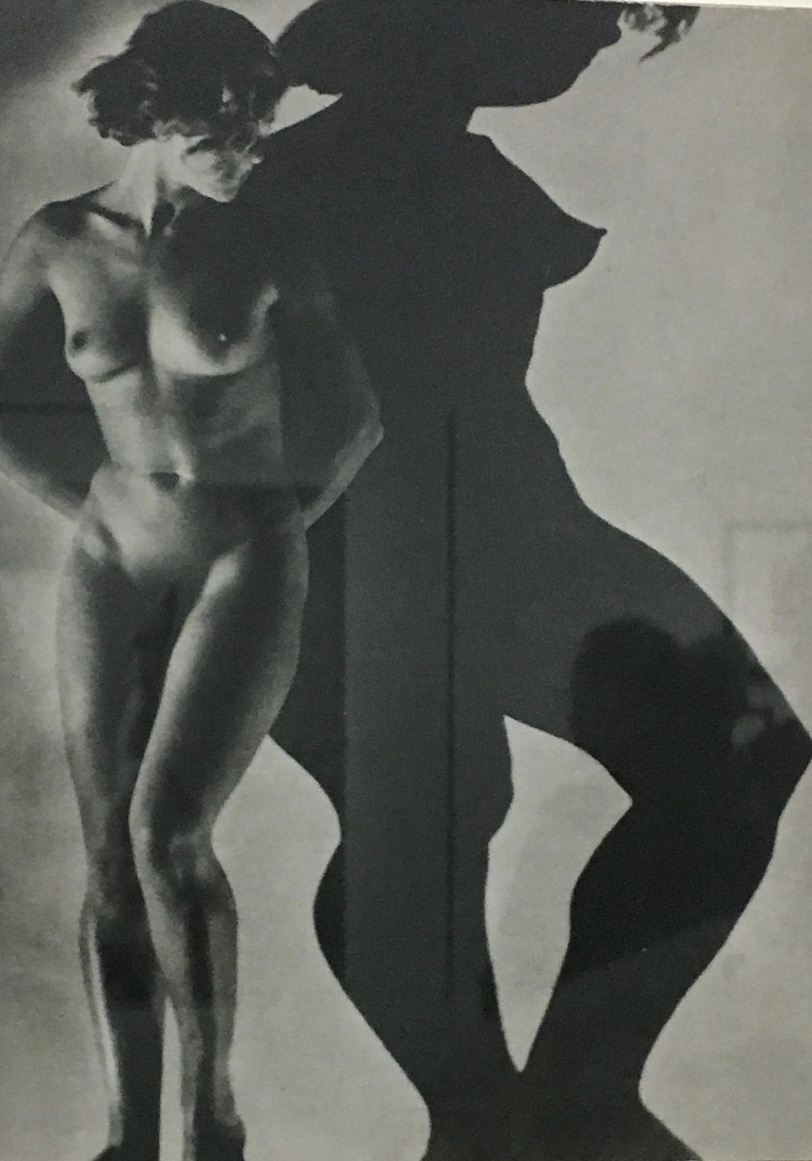 And though Nusch Éluard — whom Greer calls “the actual surreal body…” for how often she was photographed by Maar and Man Ray, appearing “slim, high-breasted, virginal” — is certainly on display in the retrospective, so too are photographs of Assia Granatouriff, whose athletic physique and confrontational stance serve to complicate this archetype. In “Assia,” a gelatin silver print from 1934, Granatouriff leans nude against a white wall, her brow draped by heavy bangs, her arms resting behind her hips. The shadow cast to her right — the direction of her gaze — looms at least twice her size, the musculature of her thighs and calves exaggerated, her breast a veritable dagger impaling the light. If Maar represented a lissome “virginal” woman at times (Nusch was, in fact, a close friend), she certainly didn’t limit herself to that trope, opting to also celebrate a more brazen, still defiantly feminine, form in works produced for art presses and highbrow erotica.