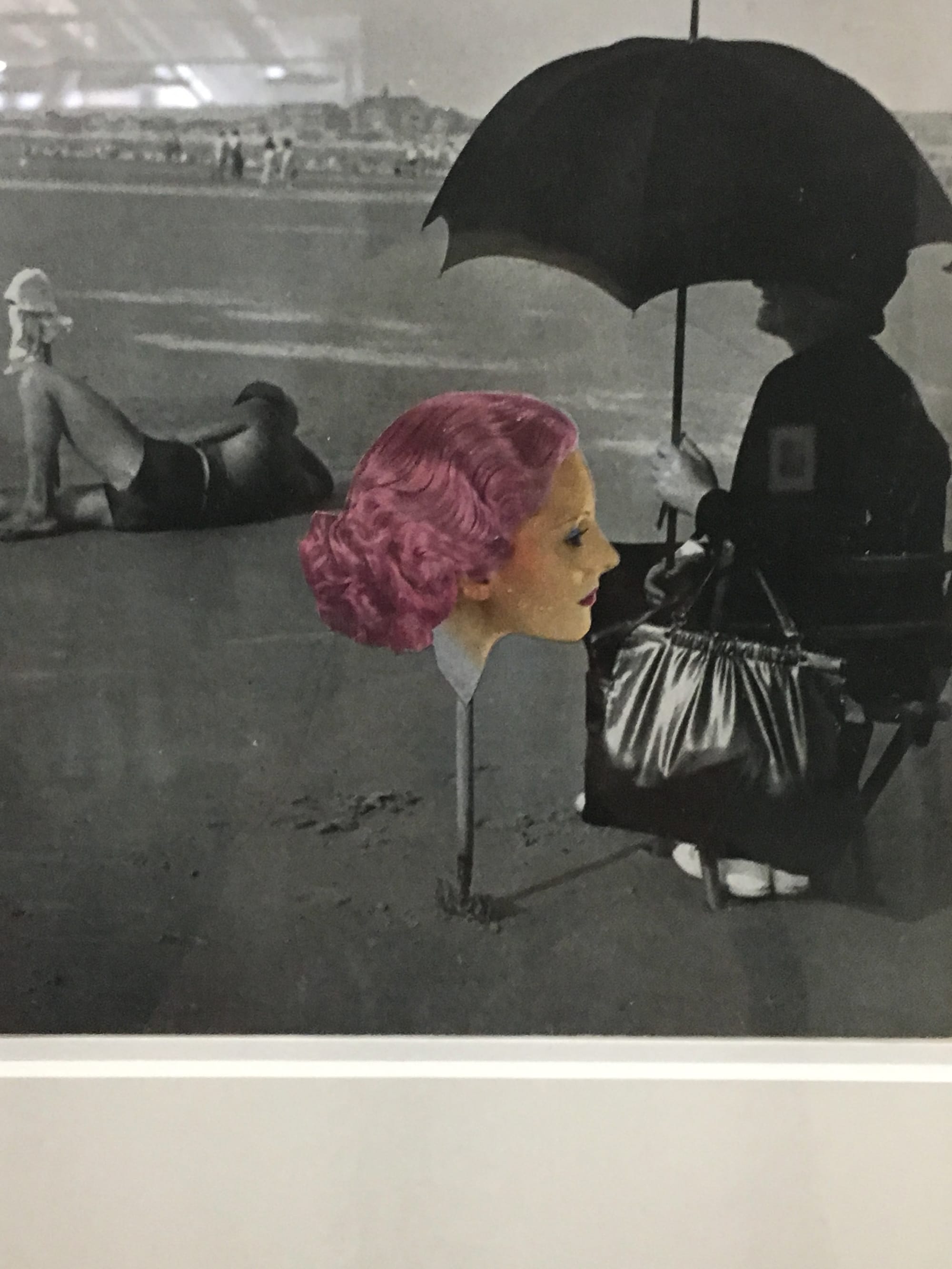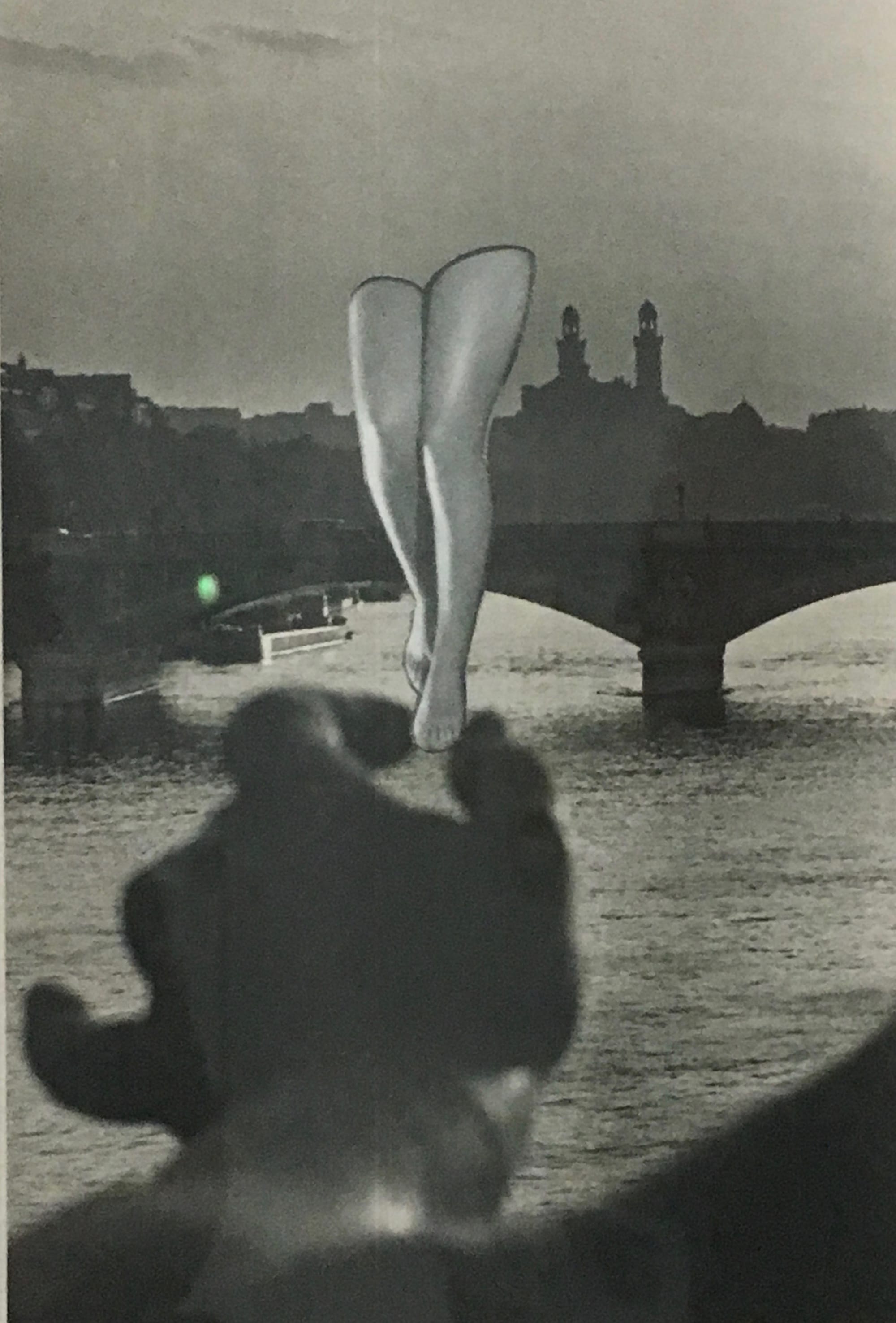 Of special note is how deftly Maar experimented with editing, photomontage, and superimposition, mingling her work in commercial fashion photography with both dreamy and nightmarish Freudian references. The composition of her black-and-white image “The Years Are Waiting for You” (1936), based on an ad for anti-aging sunblock, combines classical portraiture and horror poster. As the softly lit face of Nusch Éluard gazes at the viewer — her lacquered nails delicately framing her mouth — a superimposed spiderweb consumes everything but her eyes, a white spider listing on the bridge of her nose. In an untitled photomontage from 1935, a disembodied pair of female legs floats above the Seine, a man’s hand pinching their pointed toes; another work depicts the head of a violet-haired beauty planted on a metal stake in the middle of a beach. And in what is arguably Maar’s most famous collage of this type, a woman’s severed hand curls out of a conch shell, as though cupping the shore’s primordial ear.