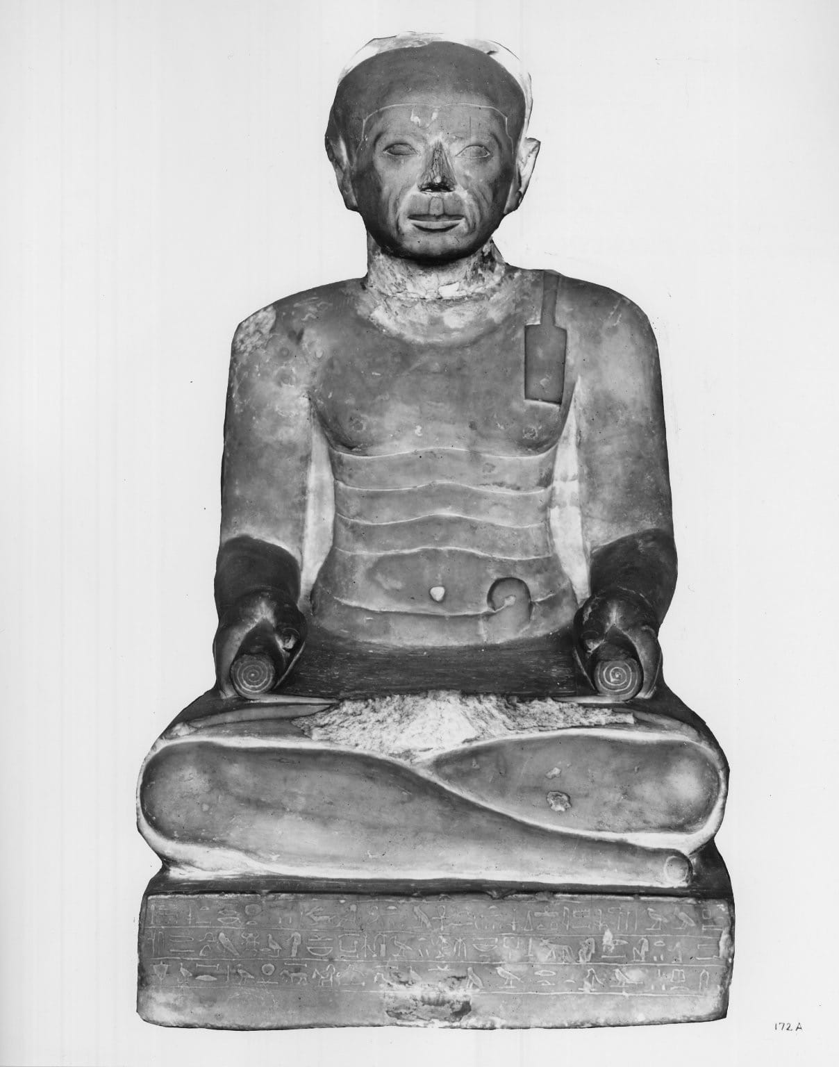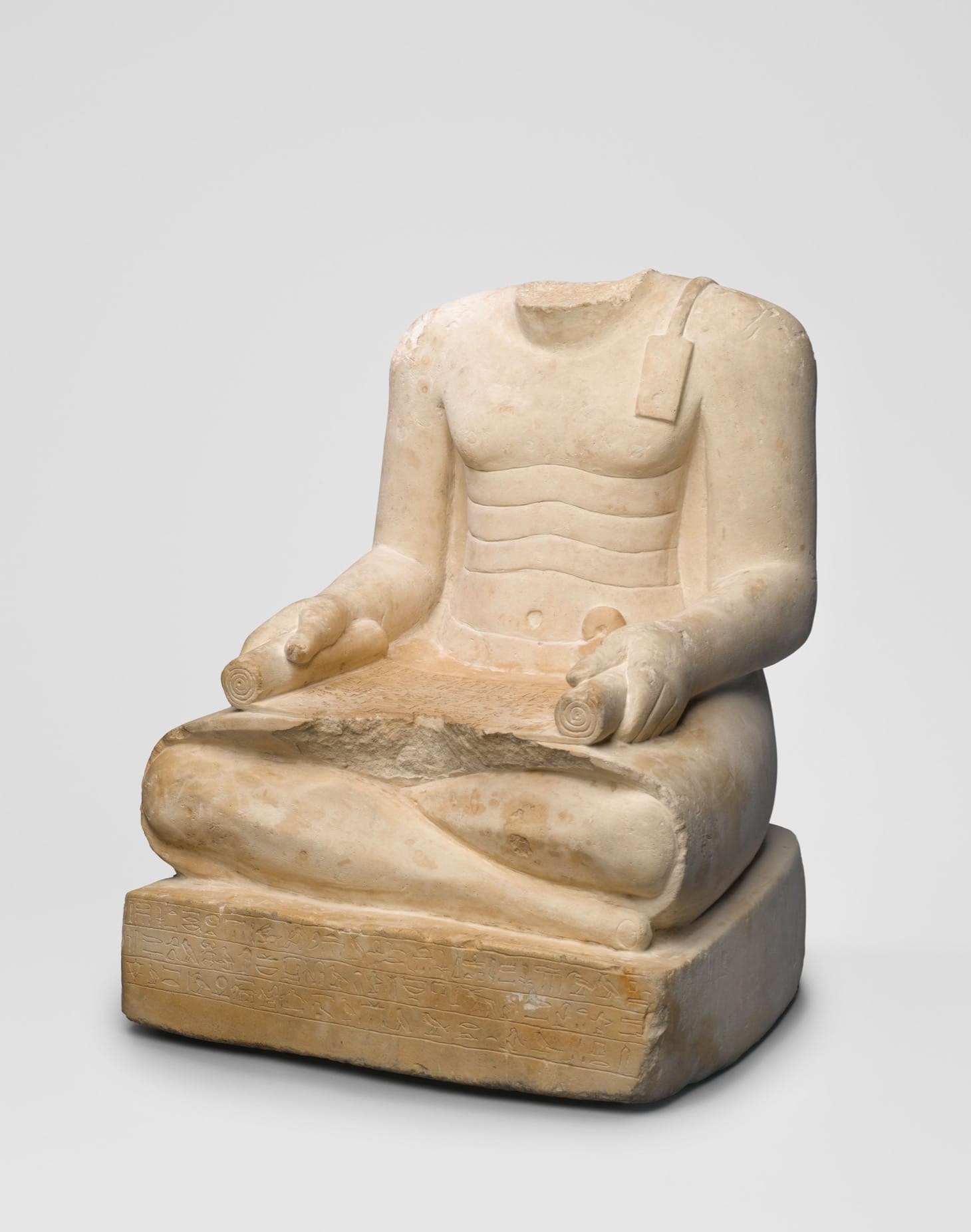 So, while we learn about the ancient contexts of these artifacts, their modern histories are ignored. On one level, we lose fascinating object biography. Take the five statues on display that are headless. When they were first brought to the United States, two of them did have heads! In fact, the Brooklyn Museum determined in 1949 — several decades after the acquisition of the statues in question (a block statue of Minmose and a statue of the scribe Djehuti) — that those two heads were added in modern times, one originally from a different ancient statue, the other a modern creation. The two statues’ original heads, it turned out, had been broken off in antiquity. (The Met’s recent exhibition World Between Empires displayed a similar example from Palmyra, now owned by the Louvre, again without highlighting the history of its one-time head.)