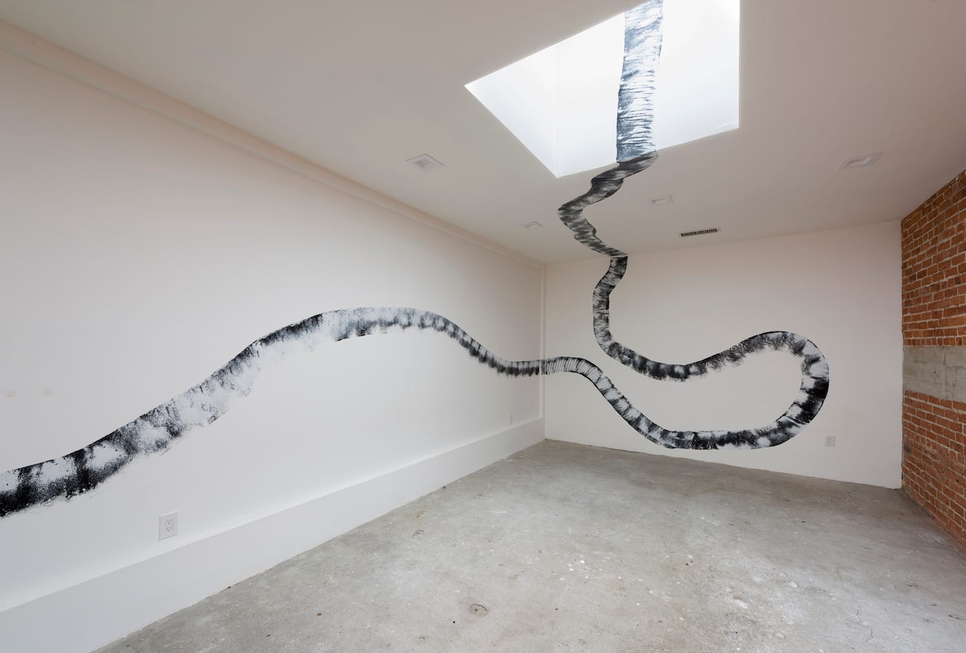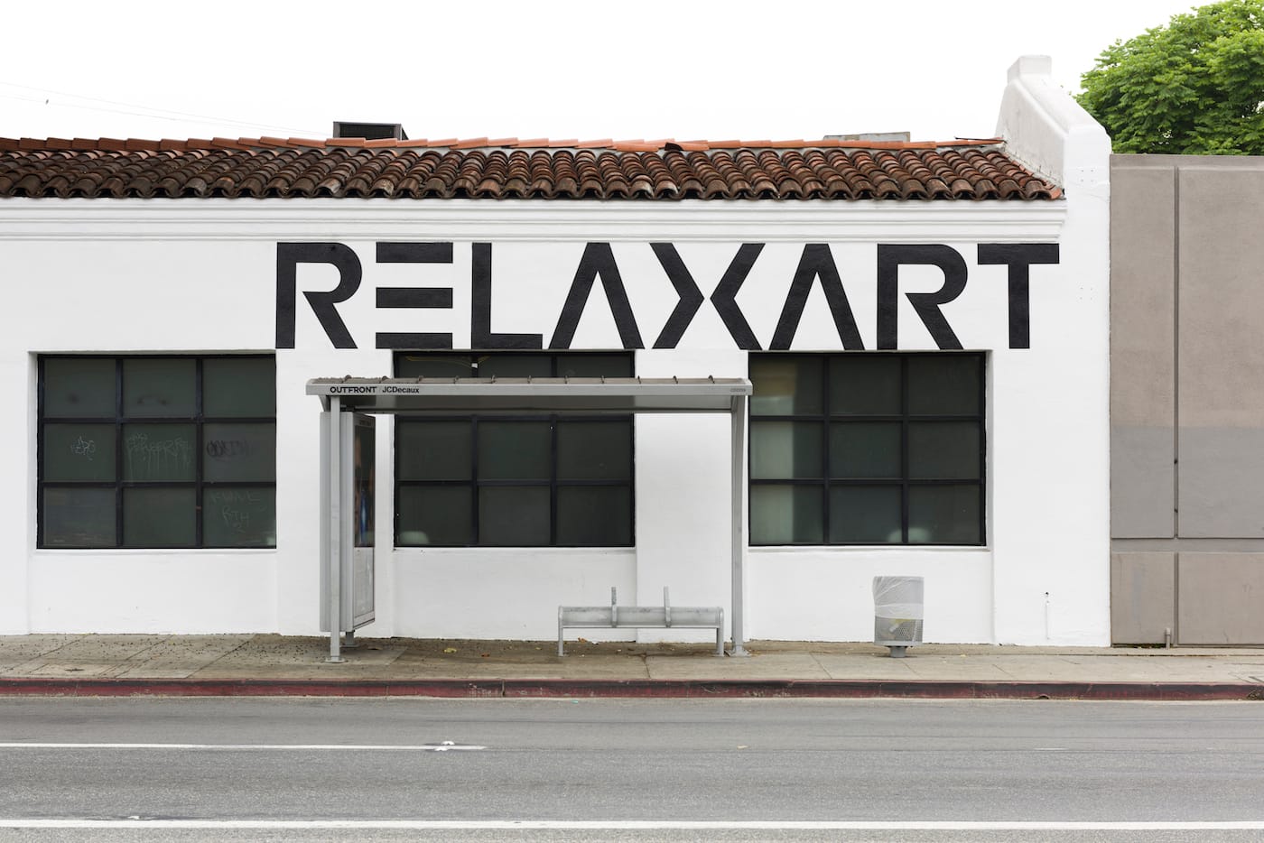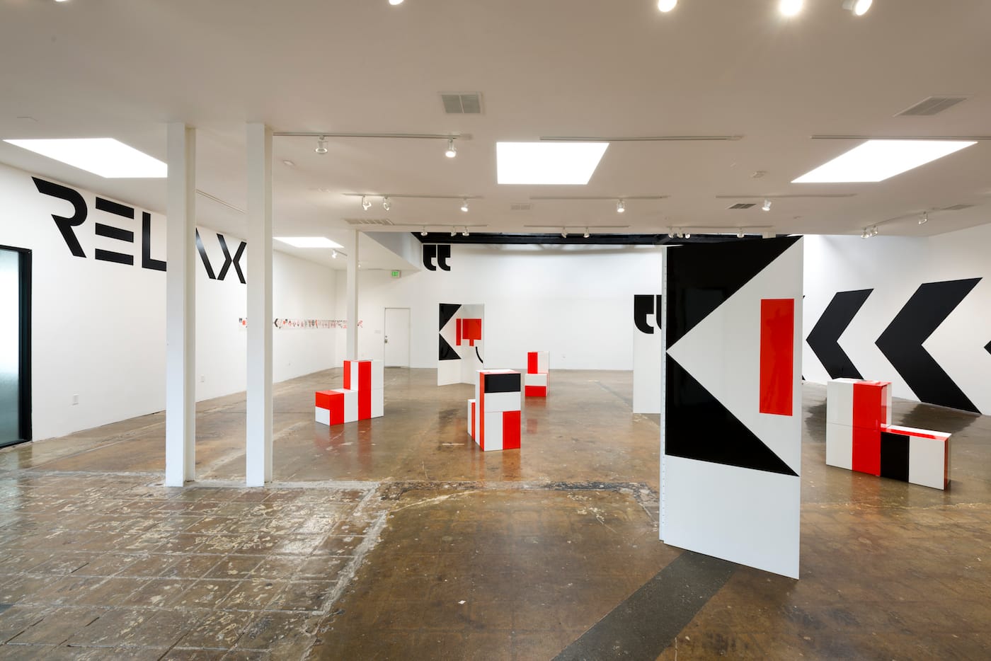 Currently on view at LAXART in Hollywood, Relax Into the Invisible showcases Solomon’s boundary-pushing practice which spans design, architecture, painting, and writing. Abstracted letterforms and hard-edge graphics in black and orange dance across the walls and free-standing panels in the center of the room, spelling out the phrase “Exits Exist.” Large cubes in the same palette are stacked to resemble chairs or tables, or perhaps just minimalist sculpture. On the building’s facade, Solomon has painted “RELAXART” in a cool sans-serif font, a riff on the organization’s name that reflects the humorous word play that she has been exploring through a series of recent illustrated books, also on view in the show.