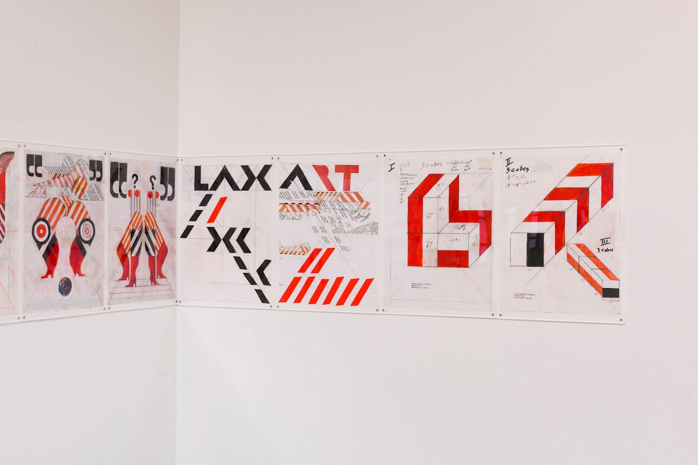 “I changed the name from LAXART to RELAXART and if they take that on I just said, ‘don’t think of me as an artist, I’m a graphic designer. I get paid for this,’” she joked to me a couple months ago during the shows install. We sat around a small table in the gallery’s kitchen, munching on cheese and nuts, while Solomon zigged-zagged across the past 80 or so years, barely taking a break to chew. She wore two pairs of glasses on her head, and black Ugg boots on her feet that she somehow made look casually fashionable. She had recently been relegated to a wheelchair after falling in the rush to get some dummies to a publisher, but that did little to slow her down.